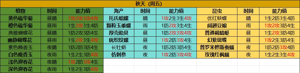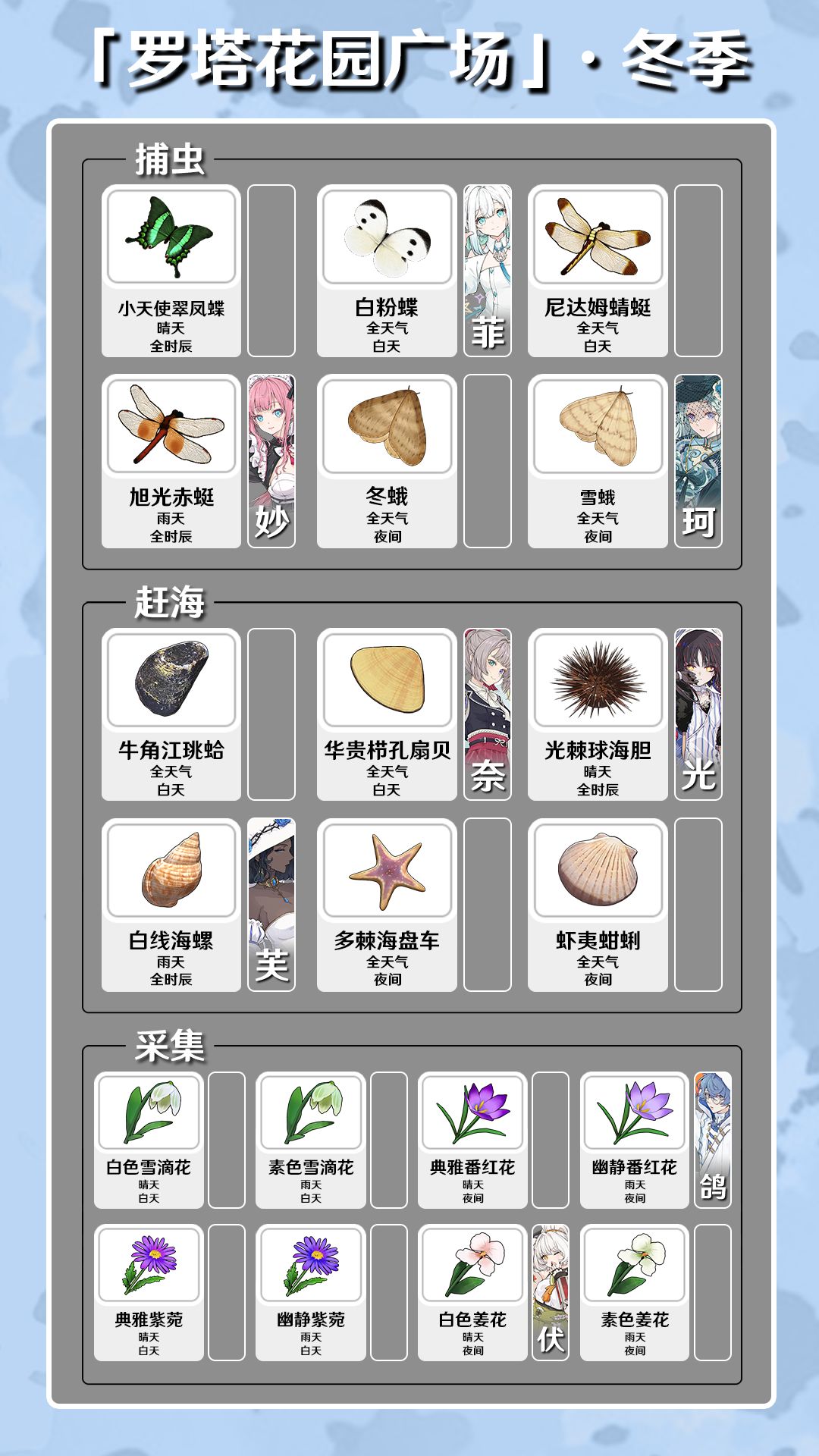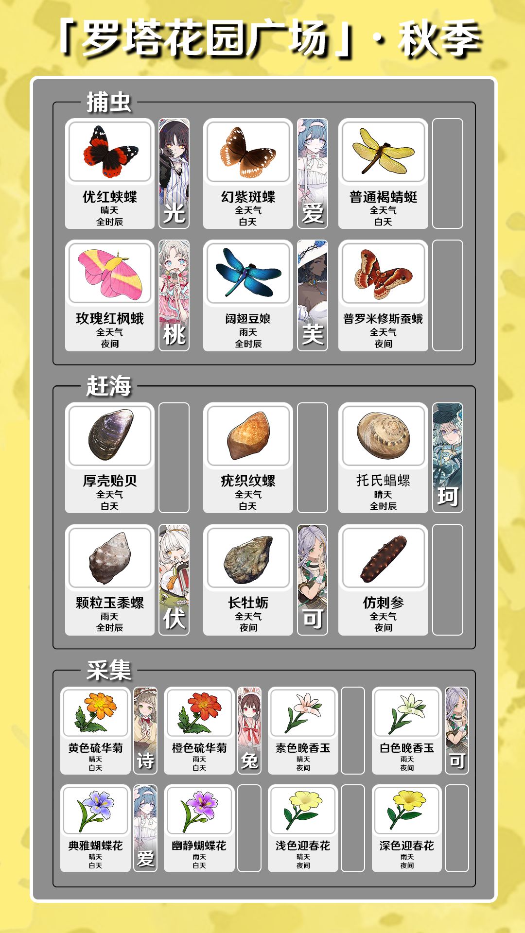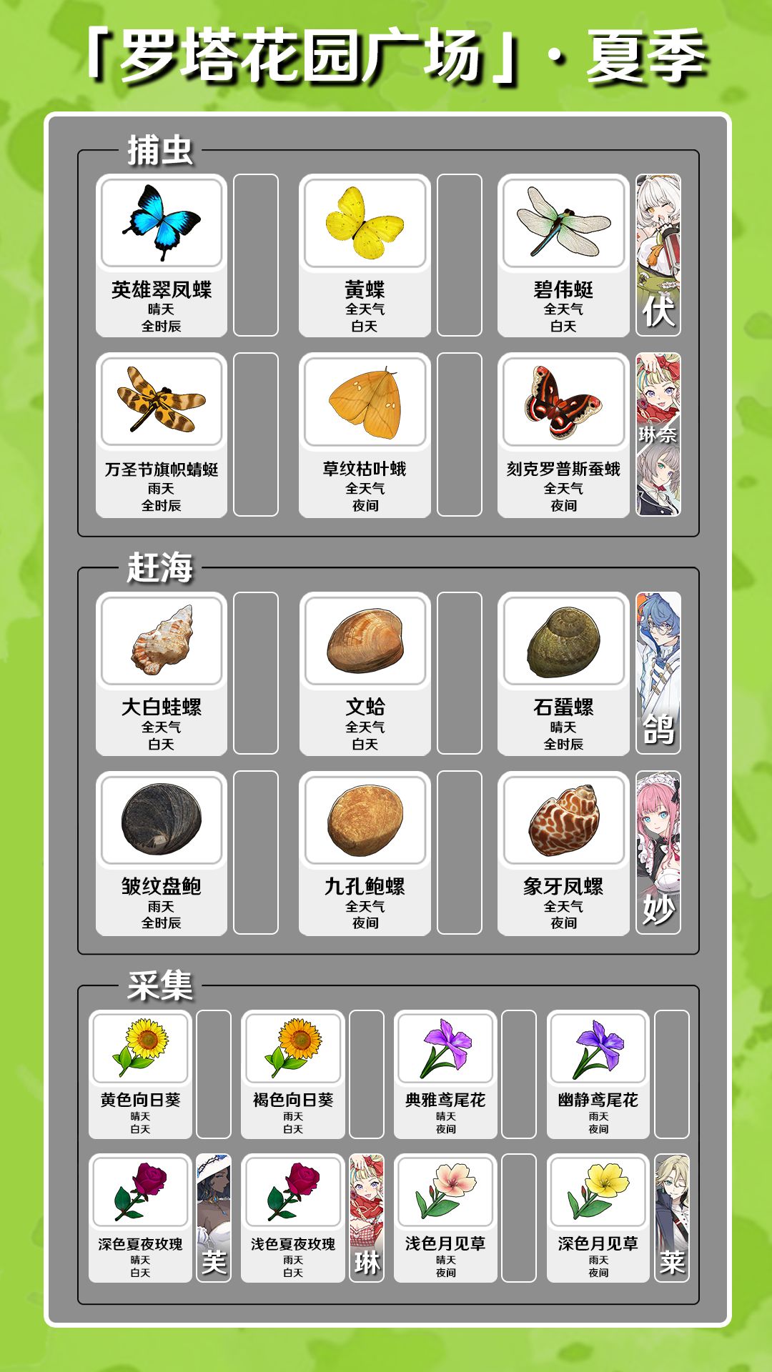 (各位补补[表情_豹哭]) 罗塔花园广场 (春季) 白天: ·毛蛤蜊,猫眼螺 ·白尾蜻蜓,金斑蝶 ·黄色郁金香(天晴)白色水仙(天晴)粉色郁金香(下雨)素色水仙(下雨) 夜晚: ·青柳蛤,扁玉螺 ·长尾大蚕蛾—母(公) ·素色夜香福禄考(天晴)白色夜香福禄考(下雨)红色射干(下雨)橙色射干(天晴) 晴天: ·瘦海蜷 ·大紫蛱蝶,白尾蜻蜓(感觉白天下雨之后一分钟以内更容易刷出来) 雨天: ·尖峰蛤 ·