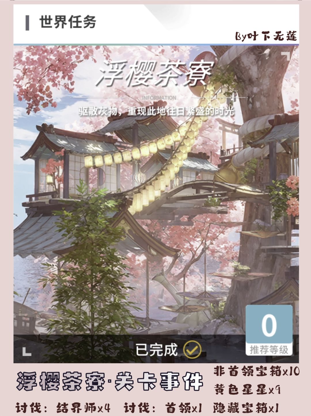 樱花季Cherry Festival~ 限时活动:4月4日——4月11日 樱花7日,樱花空间——浮樱茶寮活动副本 关卡全收集 (路线已规划) 黄色星星9个 非首领宝箱10个 结界师4个(小怪全清) 首领 隐藏宝箱 看不明白的可以问 #开放空间 #开放空间攻略
