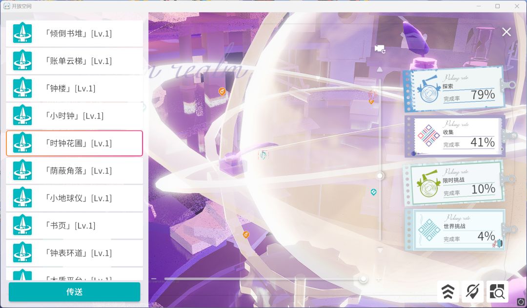 如图上发光的破风车就是异变空间的入口,异变空间的隐藏宝箱里有小地图里各种需要搜集的道具的位置地图。 可以在“手册”——“世界搜索”里看到并前往路过了但是没探索的异变空间。没找到也没关系,论坛里有每个异变空间位置的攻略。 点小地图,右下角的菜单 就有各种收集要素的位置啦~点击“区域装置”或者“转移地标”,再点击那三个向上的箭头,就是传送到你选择转移的位置。勾选文件磁带书籍等等,明显能看到哪些没收集(