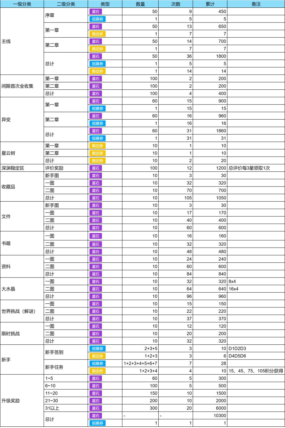 省流:不考虑图鉴(包括映像图鉴)、角色突破奖励、其他成就、间隙产出、便当星石、拉新活动的情况下 零氪全勤玩家至今可获得:42500星石、191招募券、137限定券,折合限定池约420抽,考虑图鉴和角色突破奖励等基本能获得550抽以上。 月卡玩家再+4140星石(27.6抽) 两期大月卡再+20限定券 每日礼包外的抽卡礼包全氪(花费6r+3340菱石)再+520星石、38限定券、2招募券。 只计算1