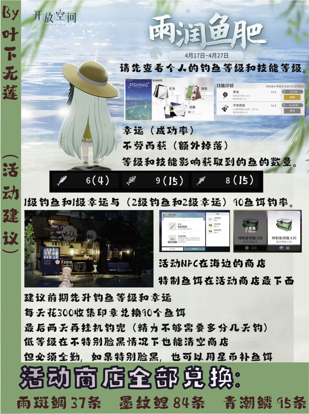 各位罗塔部的探员大家好呀,我是岚。 今天给大家带来开放空间雨润鱼肥活动攻略,本次活动共计11天。 本次活动非常简单,就是挂机钓鱼。经过测算可以搬空商店。 活动流程 1.买根鱼竿 2.买特质鱼饵箱 每天可以用猫币(印章)买3次。非常不建议花星石额外购买! 3.钓鱼 ①找一个有水的地方 ②装备鱼竿,装备鱼饵,挂机等待。 ③钓上来的鱼种类很多,不仅仅是活动用鱼,还有各类垃圾和鱼。 以下是个人统计出来的