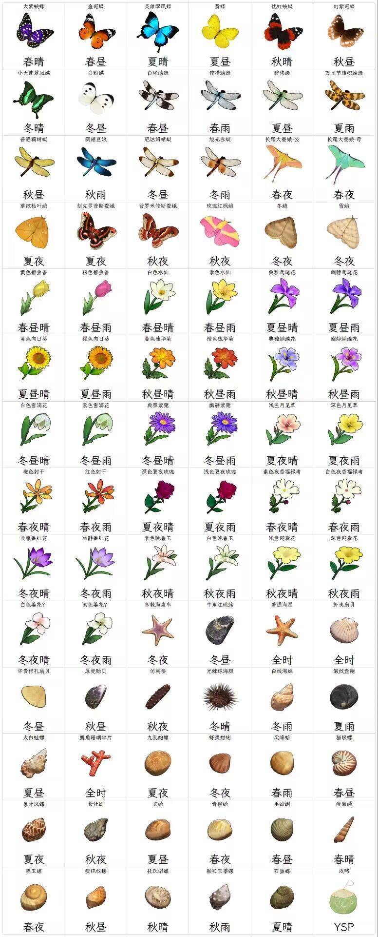 光 白色夜香福禄考[春/夜/雨]x9 优红蛱蝶[秋/晴]x12 光棘球海胆[冬/晴]x6 ps:春天采集素材已修正