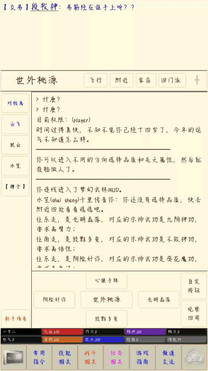 刚玩mud肯定对它不了解,玩不明白,所以说要进群,有人不愿意进群,那会很困扰,因为很多指令不是靠问就能问到的,大佬们也很忙,偶尔闲下来公频水水又是一堆问题刷屏,你们懂,不细说进群先看群文件,先看群文件,群文件!靠群文件慢慢摸索,靠群文件,群文件!(重要的事情说三遍)群文件对照游戏看完,那么恭喜你,正式成为一名货真价实的萌新,这时候游戏里还有什么困扰,或是问群里大佬,或是问公频,就都可以了。