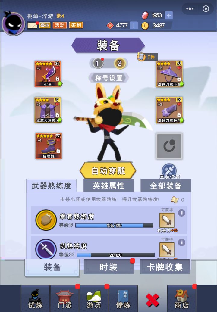 我已经不是当年的我了,经过长达167天的沉淀,豪杰到了十,熟练度全满,四个装备只剩一个没有上六星,四个装备只剩一个没有+7,虽说英雄大会一直卡在棍皇Il,但是只要这游戏一直在我就会一直肝下去,兄弟们一起努力吧。