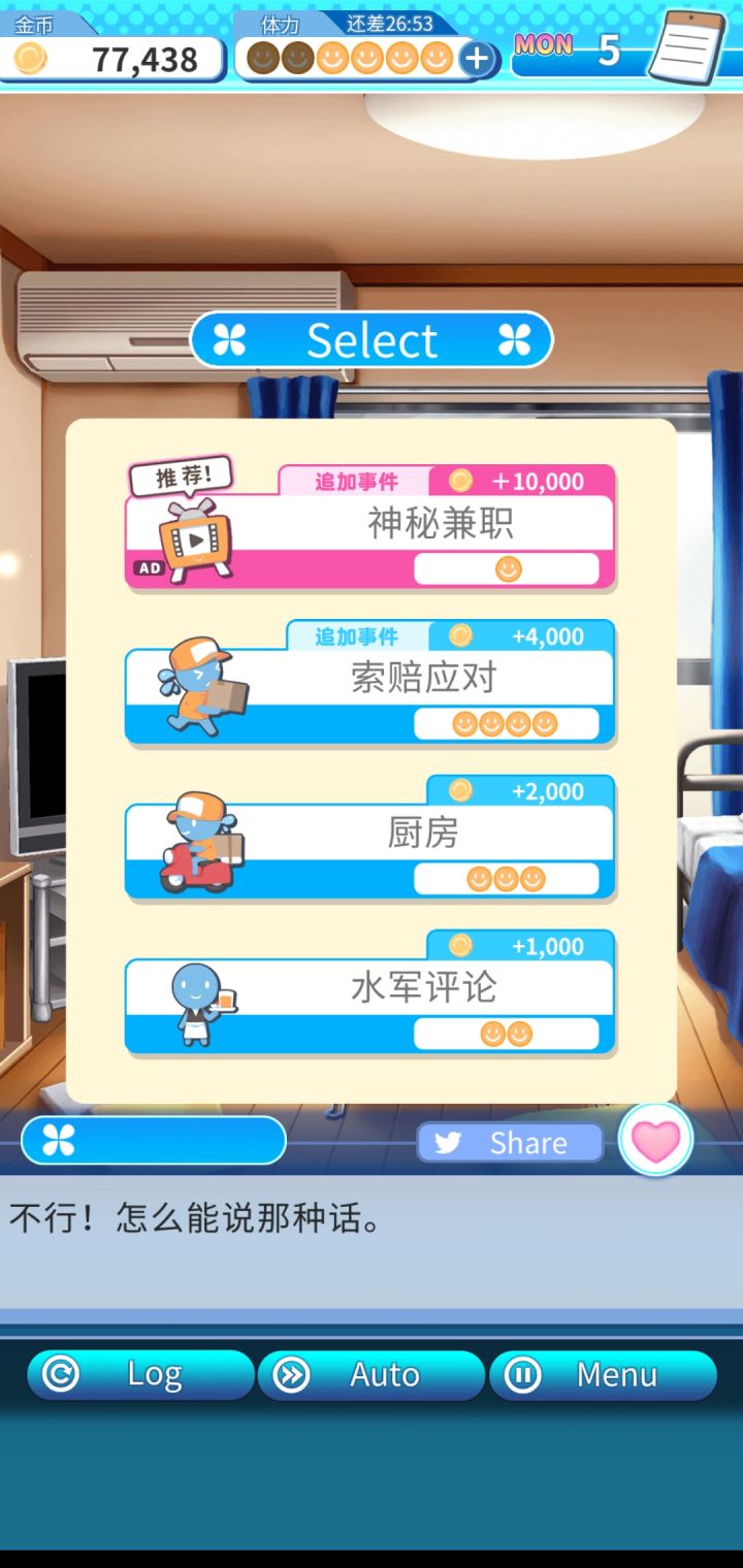 唔,体力很少诶很快就用完了,然后我现在想看广告恢复都看不了,怎么回事?这个打工也不让我跳过,没体力就硬卡在这,要等很久才能回复,你这样还怎么让别人玩呢?