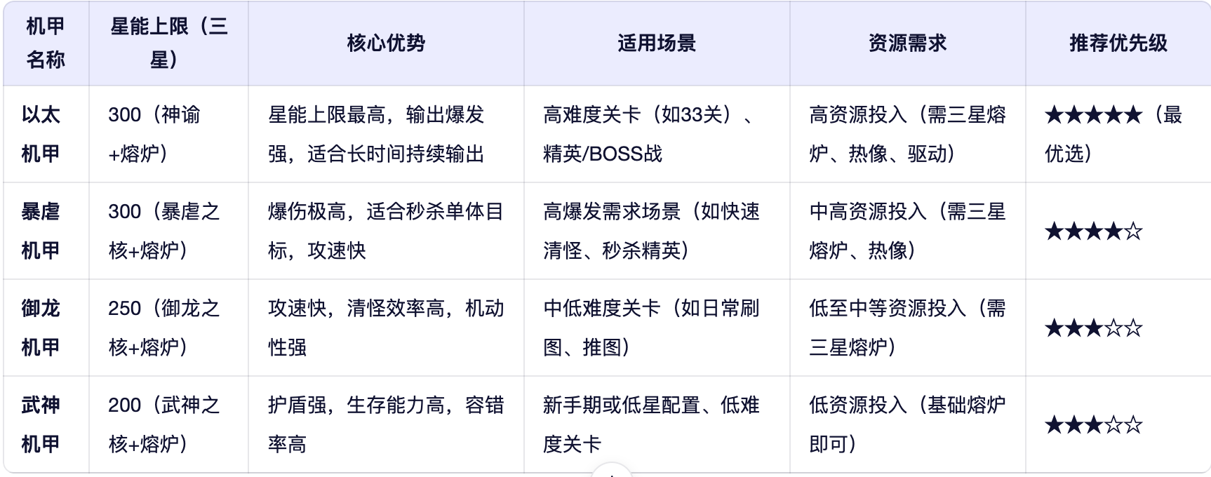关于新魔印前面的帖子有可自行去观看 重点来讲讲星辉状态 每个机甲不同 星能上限的时候会进入星痕状态 但是进入星辉状态下机甲的外观会发生变化 如图: 说白了进入这个状态几乎就是背水一战(前提是boss能撑到这个时候)增加巨额的伤害 同时机甲会在15秒后解体(也就是武器失效)需要等一个很长的CD才可以再次召唤机甲 但是召唤的机甲也只有初级状态 但是相比于之前机甲被打死后就不能再次召唤只能全程坐牢的