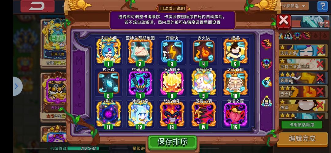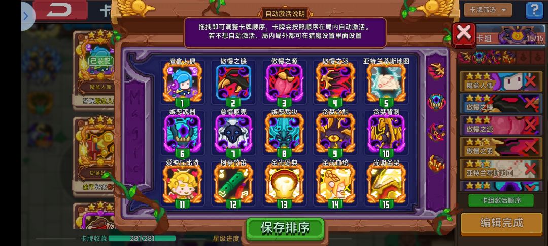 目前卡组中有5金7紫7蓝6白 目前最好玩的娱乐流派 卡组起源于七宗罪 集齐100业力可以去特殊房间进行挑战(打怪获得业力或者献祭生命获得) 七种原罪效果各有不同(随机) 效果:召唤一名恶魔帮你打工(和骨王差不多) 可以升级进化 但是我2w萤石没抽到我绷不住了 具体效果是召唤一个触手拉怪(封面效果) 技能召唤一把长枪插入地面给敌方增加负面效果(还有几个小枪)参考天使剑阵 吸收召唤物提升属性(好像也能
