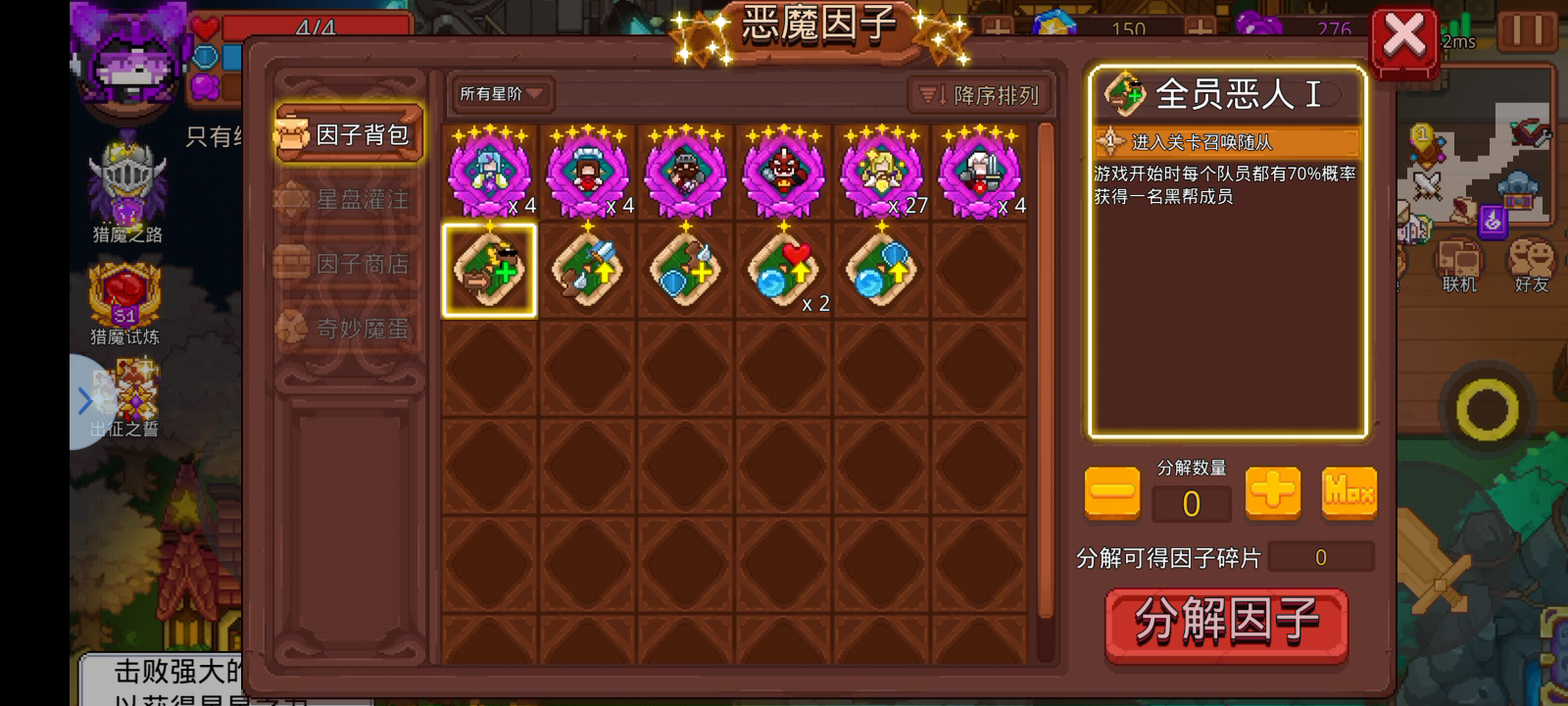 如视频,分解可得因子碎片,在因子灌注里点灌注可输入因子碎片,进度满时解锁一个孔。 打噩梦时,在0~2孔中放入因子为噩梦1,3~4为噩梦2,5~6为噩梦3,难度升高,小怪血量也升高,同时终极boss为不同阶段(就是三不同boss),特别的是,噩梦三boss需要熟练度,不然容易导致灭队。 所以,解锁孔可以提高能打难度的上限,在组队中,只要队长六孔,队员也可以打梦三,因而后面晋升要过梦三可以找大佬带打,只要不摸boss,躲好就行。 因子是消耗品,放在背包并不生效。送的紫因子分解不给碎片,真的服了这老六了。