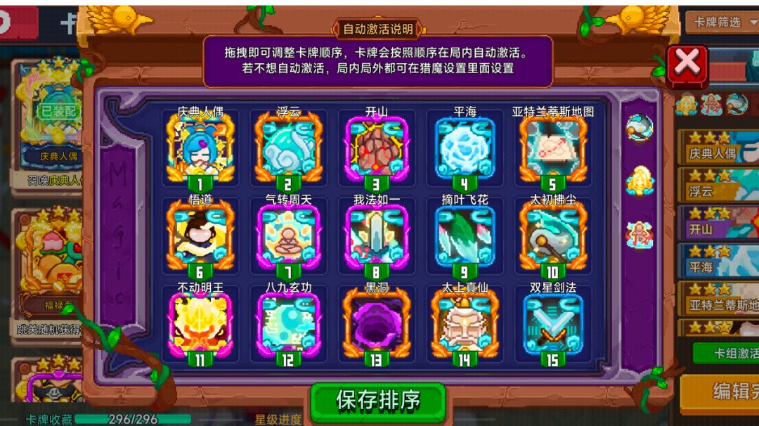 首先,卡组: 激进派: 唯一的防御卡琉璃,放到了第十位。一般二BOSS点不到琉璃,所以建议带个仙衣弥补前期防御能力的不足,和制造秒杀的机会。如果运气差,点不出九的卡组合,那就和boss拼了![表情_开心]带双星是因为我带了御剑印记,并且带浮尘的时候感觉打眼睛的时候会变慢,带了双星顺畅很多。 保守派: 先激活拂尘组合,再点出琉璃,稳字当头。但是我个人试了几次,没有激进派打鹿的输出高,并不能秒鹿,而且