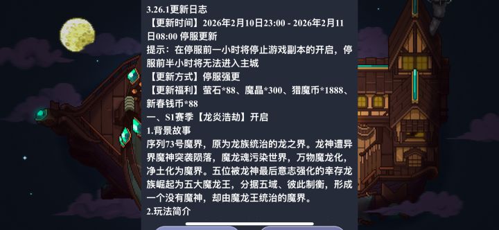 〓更新时间〓预计2026年2月10日23:00 - 2026年2月11日08:00 停服更新提示:在停服前一小时将停止游戏副本的开启,停服前半小时将无法进入主城〓更新方式〓停服强更〓更新内容〓一、S1赛季【龙炎浩劫】开启1.背景故事序列73号魔界,原为龙族统治的龙之界。龙神遭异界魔神突袭陨落,魔龙魂污染世界,万物魔龙化,净土化为魔界。五位被龙神最后意志强化的幸存龙族崛起为五大魔龙王