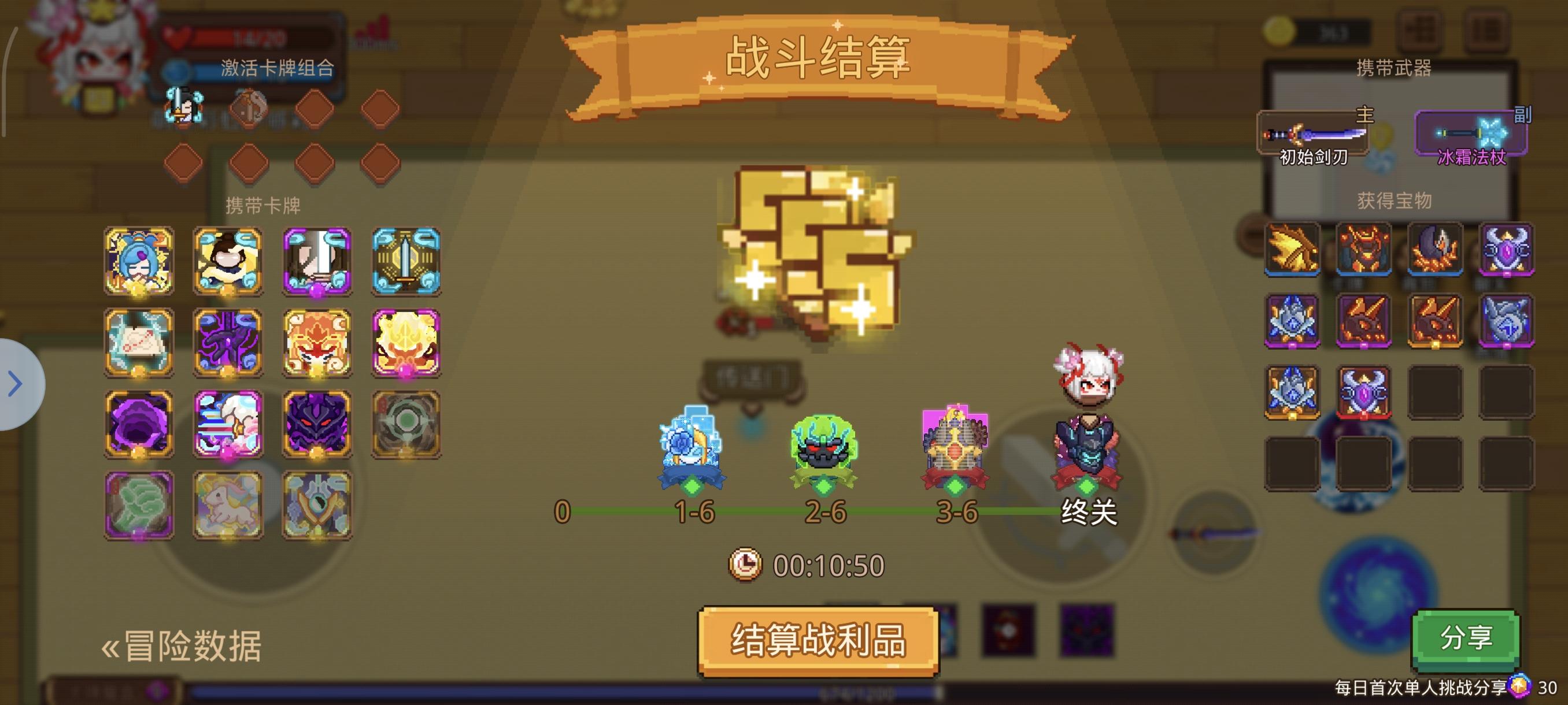 经过大佬们的指教能进十分钟也是可喜可贺!觉醒御剑,能跳关直接跳,跳不了有魂关选魂关。成就宝物带的灵魂溢出(每激活一张卡牌增加2%伤害),关卡宝物爆伤无用,但是攻击力有加成,掉啥捡啥。杜内技能尽量穿过怪物会有很大伤害加成。