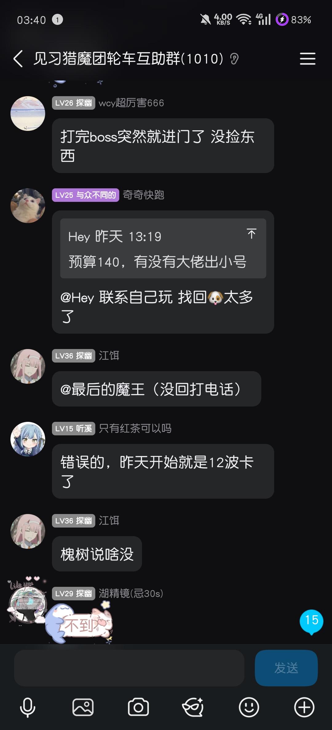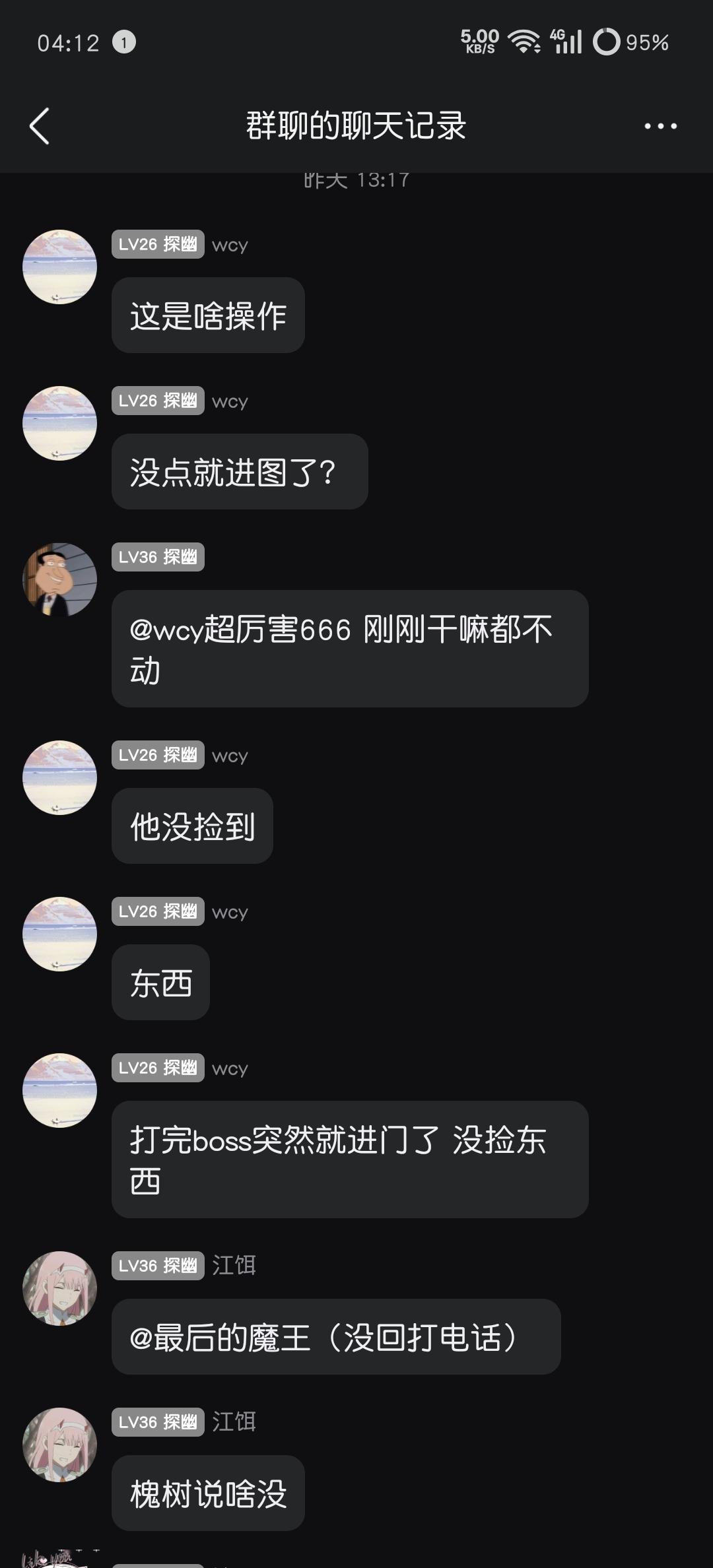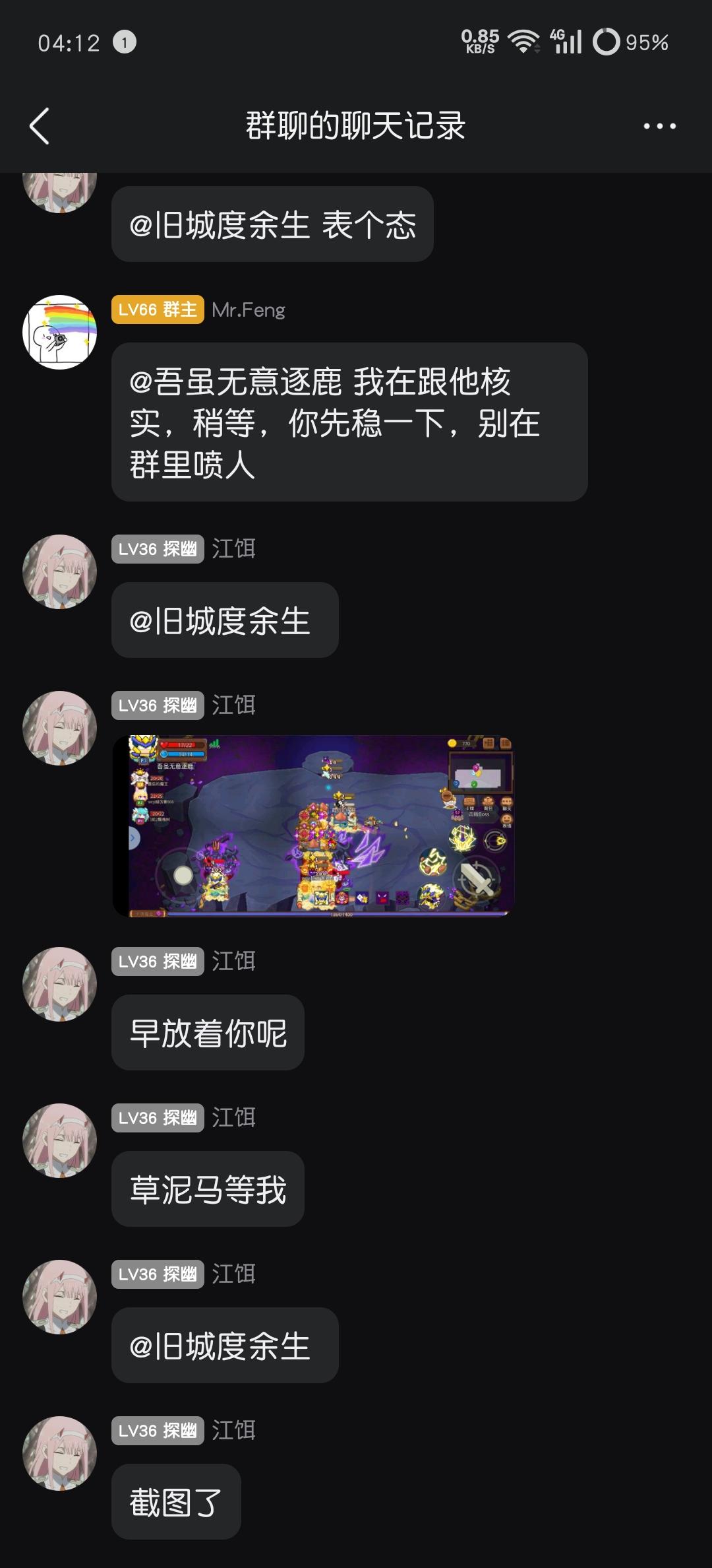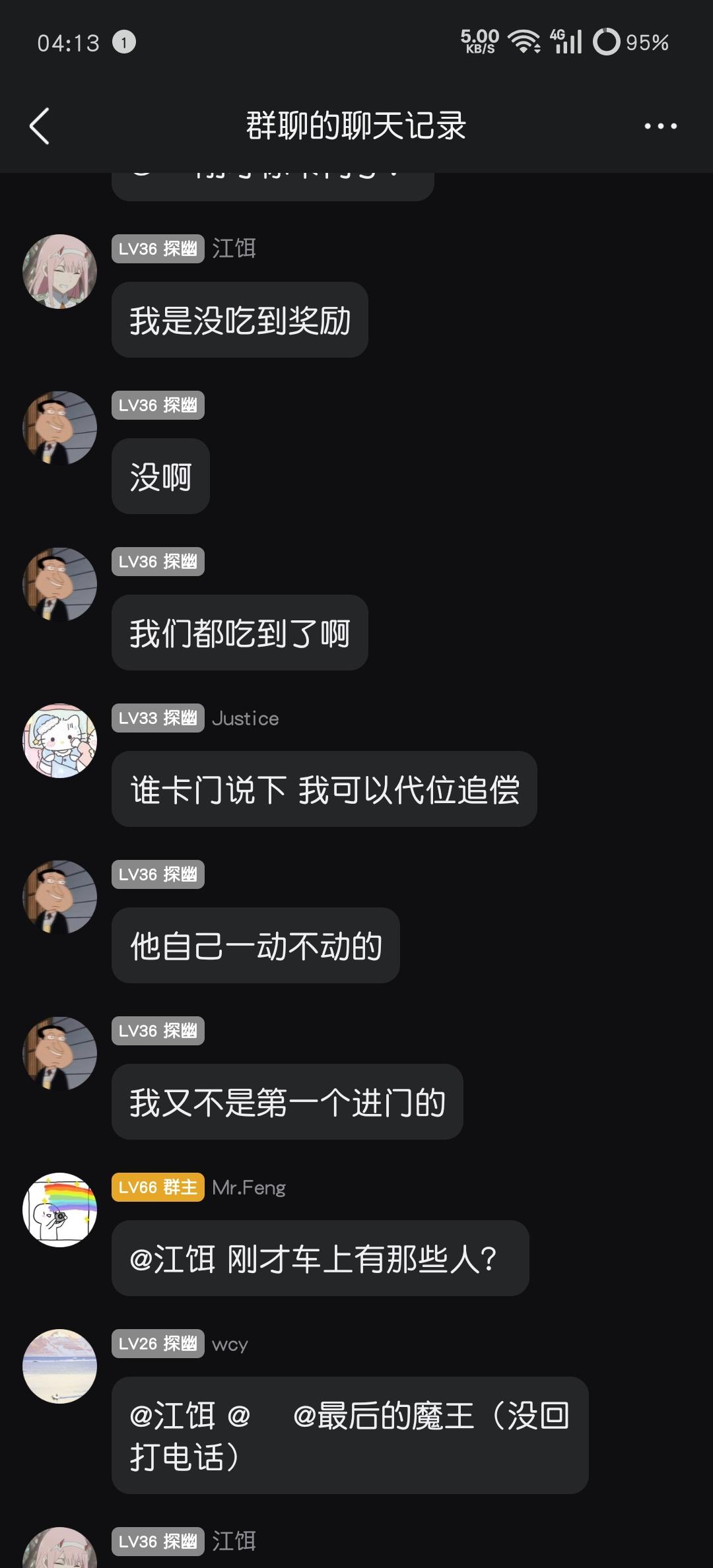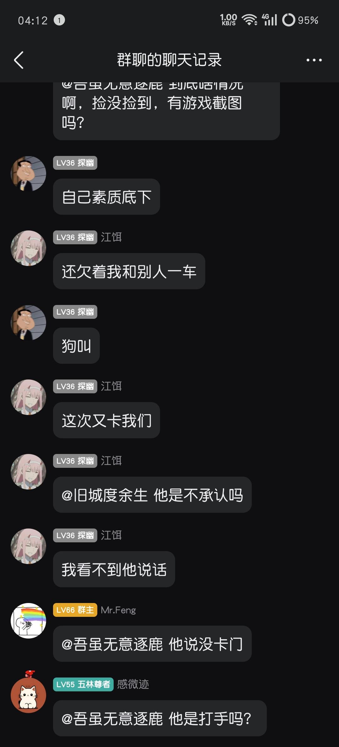 起因是(游戏iD门前2颗槐树)轮车中貌似和一位有过恩怨的玩家(游戏iD吾虽无意逐鹿)一起上车,局内起了冲突,最后boss关卡门,导致队友没有吃到奖励,遂回群中质问,并@群主判定责任,(图中用恶搞之家头像空白id人是槐树,江饵是吾虽无意逐鹿)以下来自群消息整合:同时群内多人提出被2颗槐树坑过,并质疑其人品,后续有人群友提出槐树此人在主播那坐车经常双开让别人等他,而且有时候两车都炸了,占着车位置