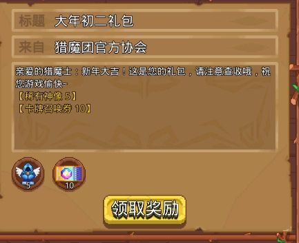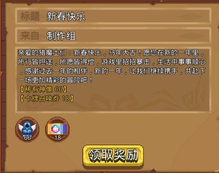 亲爱的猎魔士同学们,新春序幕已启,新年福利抢先看!🎉【新年活动资源获取渠道】1、活跃活动——稀有神像*50+卡牌召唤券*302、新春每日邮件——稀有神像*35+卡牌召唤券*70(持续到年初七,发放时间每天的0点,请猎魔士们在游戏内邮箱📫进行领取)3、新年祝福——稀有神像*66+卡牌召唤券*184、新年社区礼包码(大年初一+大年初八)——稀有神像*10+卡牌召唤券*105、TapTap