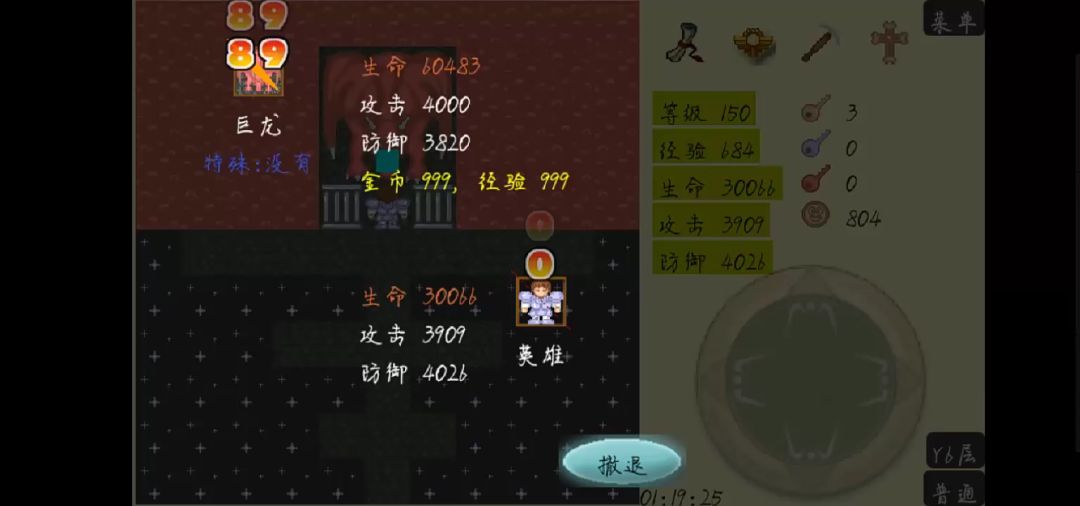 有点难顶,中断了,先传着,后面的再发一个接上,录制的画质比较高…所以…四个G…选择性观看,由于血量较高,前期大体思路:攻击伤害大于等于主要怪物生命的1/x(x小于等于10),随后提升防御,十字架要在对阵魔王之前用掉