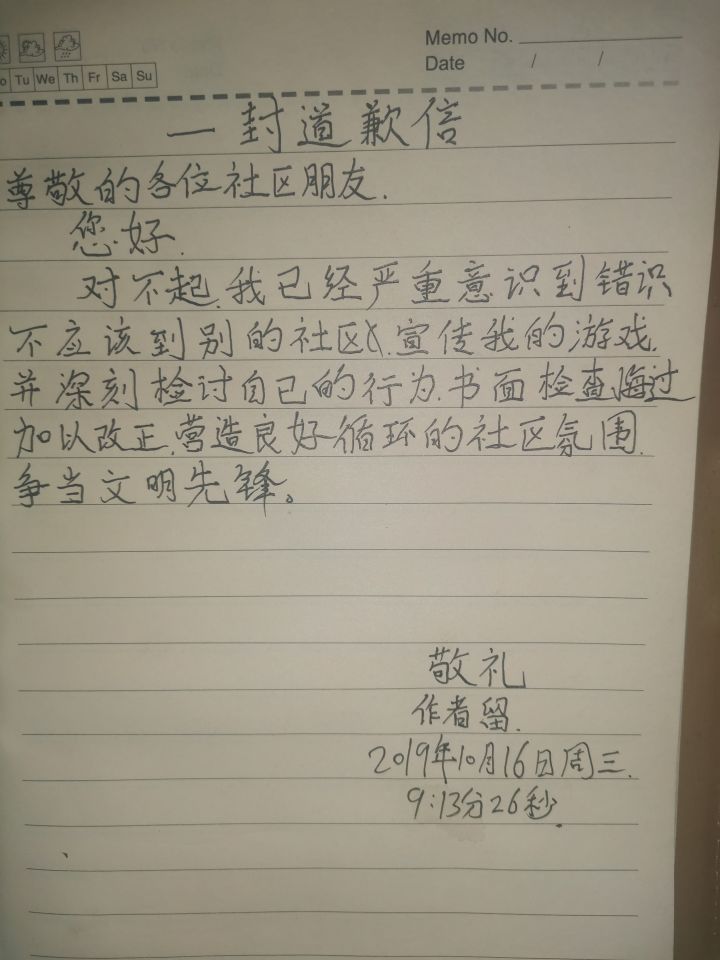 尊敬的各位社区朋友您好对不起,我已经严重意识到错误,不应该在别的社区里宣传我的游戏,并深刻检讨自己的行为,书面检查悔过,加以改正,营造良好循环的社区氛围,争当文明先锋。