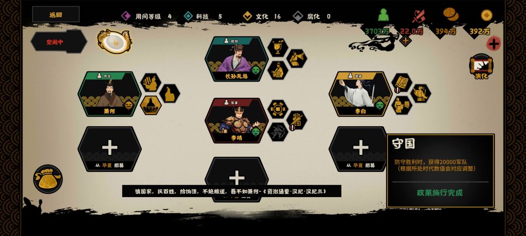 先放结算,结局汉室江山 (我大汉真的是强,防腐能手🤗 科技点了什么?和右上角四维 没什么用的势力分也放一下 注意事项: 1)可能遇到的重要选择事件,注意选项 2)攻入咸阳建议,从陇西城绕到咸阳后方,避开据点,需要先灭匈奴从上方切入 3)据点克制关系 推进对奇袭等于均势 推进对埋伏等于劣势 推进对警戒等于优势 警戒对埋伏等于优势 警戒对奇袭等于??(未测试,待补充) 奇袭对埋伏等于??(未测试,待补