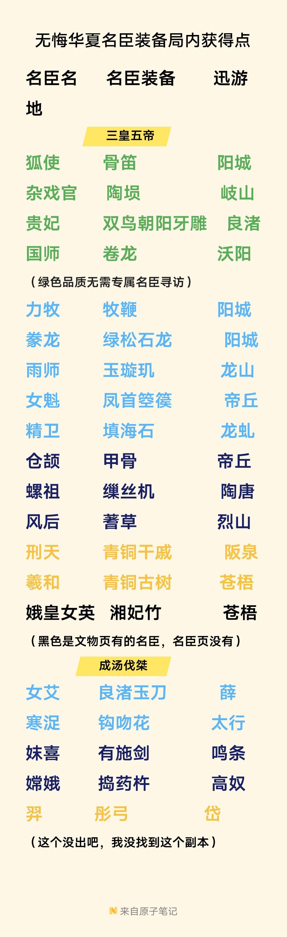 更新了兄弟们。秦楚汉的也做出来了! 补充一点,在指定地点附近城市好像也可以 (夕永)兄弟的亲身经历 全通过后就开始收集名臣装备,在网上找不到攻略就自己统计了一下名臣装备。(因为我老玩一般不爱点山海界翻来覆去觉得麻烦)兄弟们真的会有人和我一样现在就开始收集这个了嘛。有没有好心人告诉我缺那两个位置。如果对大家有用的话,还会更新的。(虽然我自己都觉得这个只是锦上添花) 补充一下个人感觉这个还是比较有用的,减资源挺多的 谢谢老甜筒不甜的补充~( ̄▽ ̄~)~,已经收集全了 更新一下吧,最近玩无悔都天天养老了!看到游戏攻略那么多精致的帖子我才发现原来距离我当初删档一测二测都过去3年了!真的挺谢谢兄弟们的支持了,我也没想到当初游戏开荒时的善意发帖真的能帮助到这么多人!