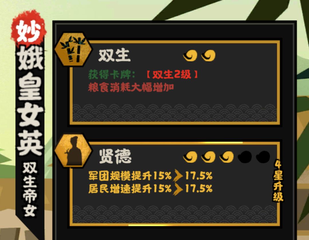 娥皇女英作为为数不多的妙级名臣(目前可刷),是很多小伙伴期待的。 政策一:双生(复制一张用过的卡牌,粮食消耗大幅增加) 政策二:贤德(军团规模提升,居民增速)一星好像是各自提升10%,五星是各自20% ————————————— 没有娥皇女英的小伙伴到三皇五帝时期,云梦泽刷(50),时间是3489(最晚出现) 装备:湘妃竹[苍梧]巡防(巡防的时候可以看看该地有没有其他文物,也就是装备) 需要碎片5
