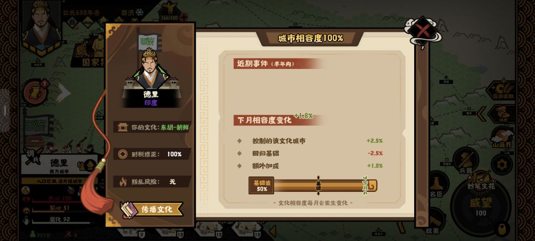 文化影响:影响国家集团的归化度、城市反叛概率、城市资源产出量、城市被进攻时对进攻方造成的战斗力和军规的影响度(城市相容度越低对方进攻难度越低) 如何改变文化相容度: 一、时间,每个月文化相容度会向基础值靠近,也就是超出基础值,月末就下降,低于基础值,月末就上升。基础值数值在图一下方。 二、传播文化,在图一中选择传播文化,选择传播的书籍可以大幅度提升对该国家文化的相容度,同时小幅度提升对该文化组的相