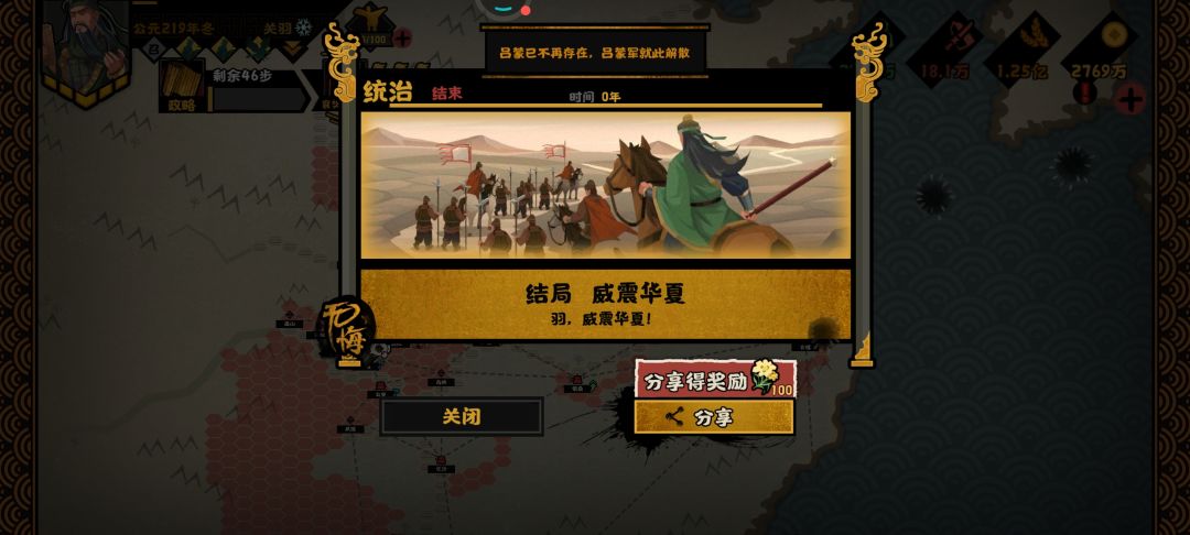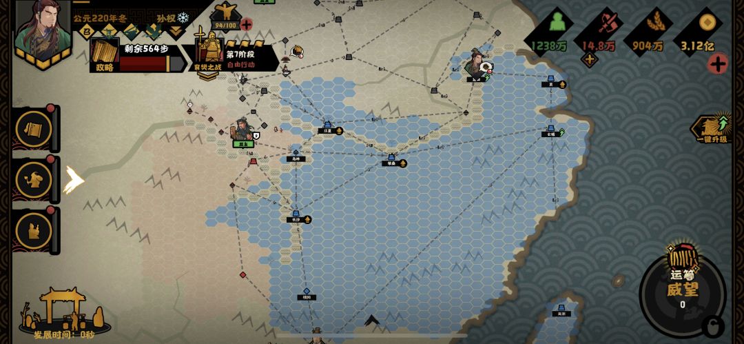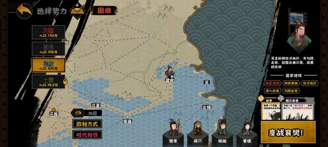 襄樊之战的史实结局速刷不光刘备势力可以用,曹操势力也是一样,而且曹操开局就有曹仁,所以还能多刷一个曹仁的碎片。 而孙权势力开局也有吕蒙,但是孙权的史实结局流程和曹刘两家不太一样,这个攻略就来讲解下如何刷取吕蒙。 开局是一样的,利用国家政策中的货殖之利,一次消耗75政略,把我们的政略消耗光。 最后剩下一点政略,进攻一次士燮势力就能用掉。第二第三阶段也是一样,消耗光政略一直跳到第四阶段。 孙权