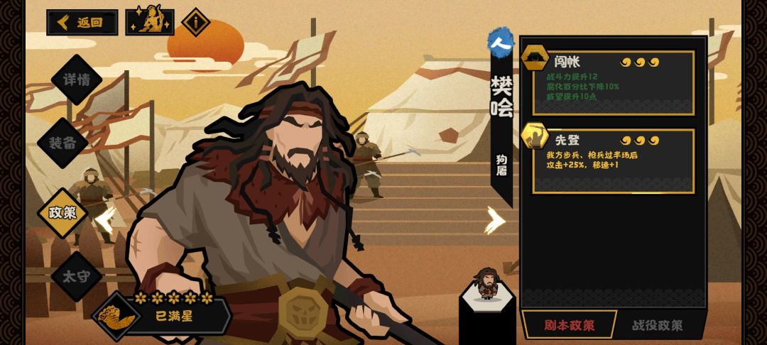 这个方法主要利用襄樊之战史实结局,不用完成前三个阶段任务,还能席卷获得碎片的特性。 难度选择困难或挑战,名臣没有要求,带上你想刷碎片的就行。 开局利用政治政策中的货殖之利,一次消耗75政略,把我们的政略消耗光。 最后剩下一点政略,只要进攻一次曹操势力就能用掉。 政略耗尽之后直接进入第二阶段,继续用货殖之利耗尽政略。 进入第三阶段重复第二阶段的操作,继续用货殖之利耗尽政略。 进入第四阶段之后不要再用