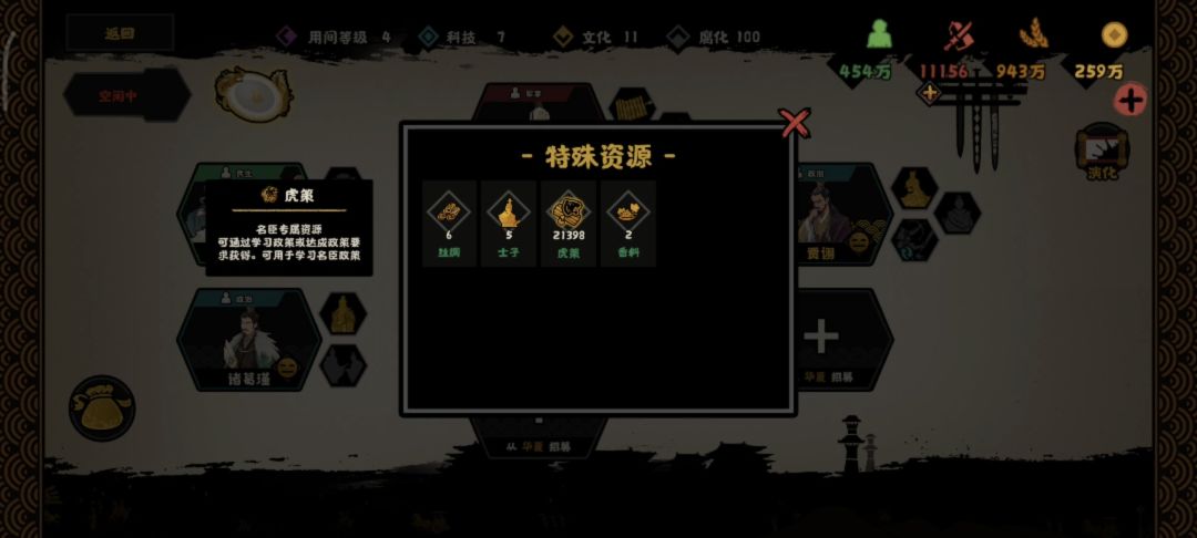 思路说明 无悔打主剧本相关的局内指标目前有:战斗力/军规/武器/武将/兵法 因为对于新人来说不一定有好用的武将和兵法,所以这个思路只讨论前三指标,如果你有好的武将(比如张飞)和兵法那就更好啦! 这个思路简单来说就是,搞钱粮(无论是掠夺还是增加发展时间),强化武器,点战力和军规政策,然后一路平推。 为了验证我这个思路,我选择秦楚汉剧本刘邦为例, 负重通关: 1.只带两个原始人名臣:妇好(抢钱粮+战斗