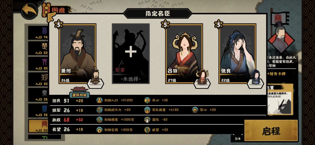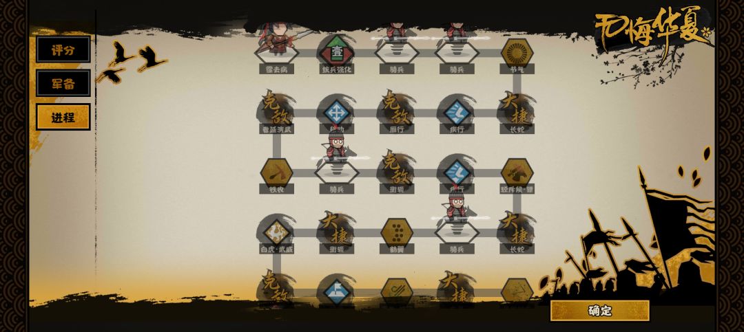 开局先存档,然后统兵强化,一次刷新三个,拿骑兵或者车兵,刷不到的话就sl,我这边拿的是骑兵开局再拿一个就二级了,因为后面弓兵也多 政策有到据所拿粮的就点,霍去病的特性就是到三次小据点就给5粮,到探查的地方可以先存个档然后探查看看走哪条路 骑兵或者车兵到3/6/9去隐士点都会有一次质变,利用好探查的sl可以省下粮草用来刷新兵种或者买buff 有星罗或者其他无负面buff的可以考虑拿 注意!!要刷霍去