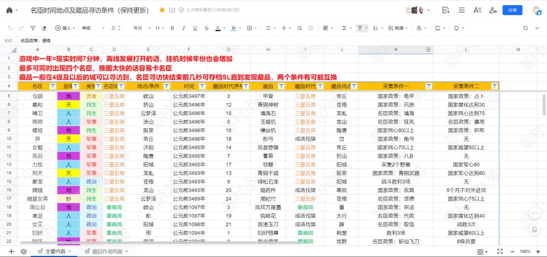 今天带来名臣时间地点及专属藏品寻访条件一览,会随着版本更新或者勘误持续更新,按图索骥,方便集齐名臣及藏品! 已知的名臣及其专属藏品都有收录 支持筛选,名臣品类、类别、藏品条件等都可筛选 表格链接如下: 表格制作不易,麻烦顶上去让大家都看到