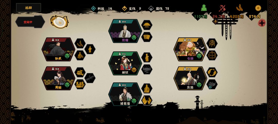 困难孙吴,席卷,给还没有周瑜鲁肃的人参考 民生 解忧,前期50战力缓解压力,后期百分比 军事 孙武,主要抢威望开会,前期看情况买马点40战力,用间等级+2能缓解曹操的疯狂使坏 政治 范增,最好五星,一次威压两个比较快 贤者 仓颉,东吴真神,前期东吴非常卡特殊资源,科技很慢,仓颉极大释放东吴前期政策潜力,但是会因为点政策缺钱粮,发家的地盘太小了收租少 如果只缺周瑜,地图招募诸葛瑾左慈,诸葛瑾可以提供