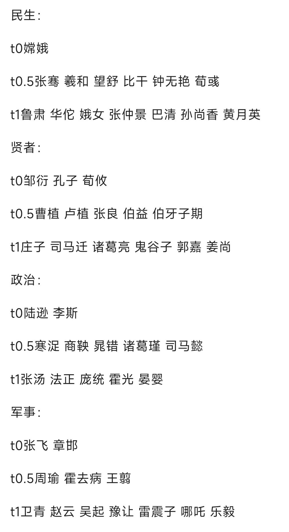 t0级名臣特点:通用性强且能自行启动,特资消耗较小,战斗能力或辅助能力顶级,开局就能carry,综合实力强。 t0.5名臣特点:具备一定的通用性,作战能力或辅助能力较强,特资消耗一般(或较大),需要绑定特定阵容或特定名臣,自启动能力较强。 t1名臣特点:需要绑定特定阵容或国家势力或兵种,作战能力一般或需要一定时间发育达到较强的水平。
