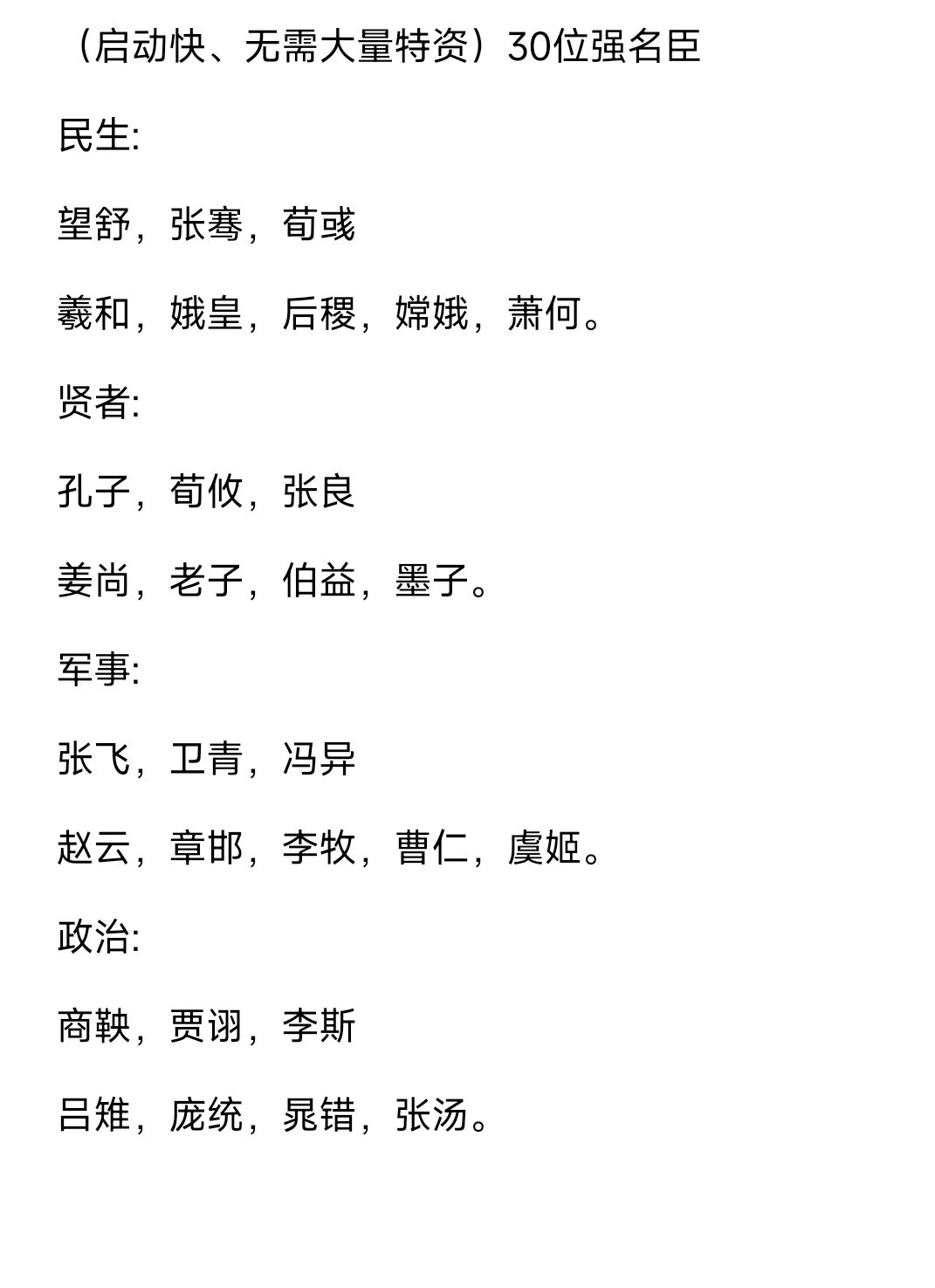 相信大家初玩这个游戏,都会被游戏里名臣的强度所吸引吧,很多名臣虽然技能很强,但动不动就需要几匹马,几个士子啥的,大量特资限制和科技限制导致前期无法启动(除非开贸易),启动就需要贸易,贸易又需要不停拜访或者使用特定提好感的名臣比如诸葛瑾,鬼谷子,范蠡,贾诩等等,很麻烦,很影响游戏体验(当然也不是说不能这么玩啦)。 所以我整理了30位强度还不错的名臣,不需要大量特资,开局就能启动,这个表格里面只有少数