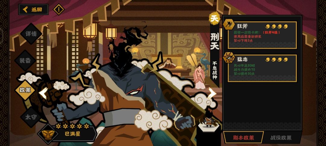 咱们直接直奔主题 (五星为主) top1 刑天 一技能狂斧获得卡牌【狂斧】,军心下降4(谁用谁知道,用过的都说好,虽然会对己方军队造成伤害,但是可以用移动卡牌提前拉开) 二技能猛志:民心不足50,战斗力+70,军心+30 (如果不开盘子,民心很容易低于50,很容易弄出来70战斗力) 刑天主要是一技能斧子造成的伤害高,而且二技能也很容易触发,白嫖70战力很容易 top2 妇好 妇好之所以能排上来,是