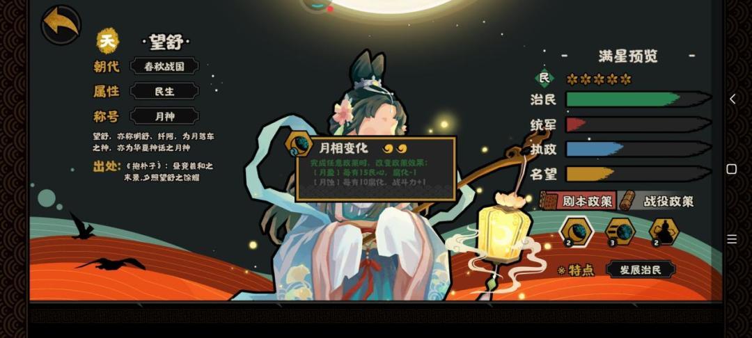 近期无悔华夏一周年的周年庆活动中出现了几个新名臣,如天极名臣望舒,地级名臣晁错以及需要氪金的妙级名臣蒙恬。今天本人也是趁这个机会来具体说明一下望舒的强度问题,下面是本人的分析和讲解。 首先先给大家看一下望舒满星一技能图示,如下图所示。 月相变化政策相当于狗卡中的阴阳卡,只要做完政策,假如之前是月盈状态,做完政策后将会是月蚀状态。月盈状态:减腐化,按照计算最多一次减去6腐化度,可叠加。月蚀状态:根