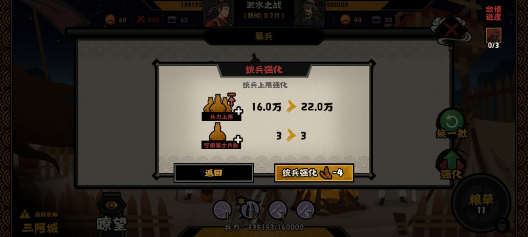 开局还是先强化统军,买每到一个新地方加粮草的。后面要庙算达到才能继续点加粮草的。 阵容一直枪兵和苻坚上场就行了,可以打一下3级据点。开局9级枪兵肯定用特色兵种。 隐士的话有点用。有时是加防御的。 星罗棋布能买就买。 洛涧之后是淝水决战。如果要兵多就买山民。是可以比他兵多。 兵多就2、2、2。兵比他少就3、3、0。 隐藏结局淝水之战战败就这样。 #无悔华夏 #无悔华夏两周年 #无悔华夏两晋 #无悔