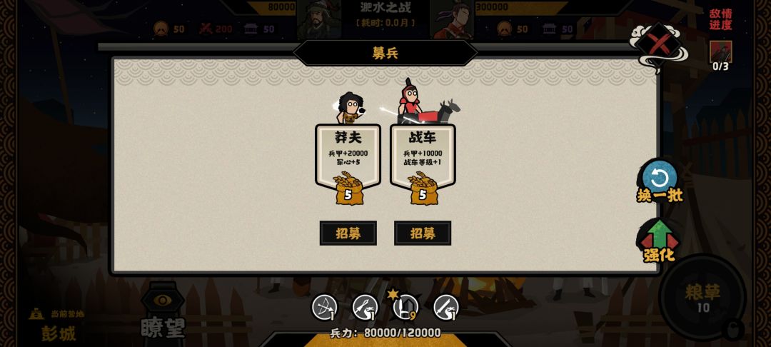 打了2把!一共差不多用时3个多小时 第一把,因为不知道打完月氏后没探索就直接打到祁连山就12w多兵。还分2个3路兵,进去被人随便杀[表情_捂脸哭]就输了。 第二把还行 2把打完就一个想法往右走!一直往右走!战役玩法其中最重要的是兵种克制和自己对士兵的控制,当然运气也很重要! 我说说自己通过tap上的攻略后的游戏理解。 开局最好先(sl)从战役策略拿到星罗棋布,然后就招募兵种(重要)最好可以sl得到
