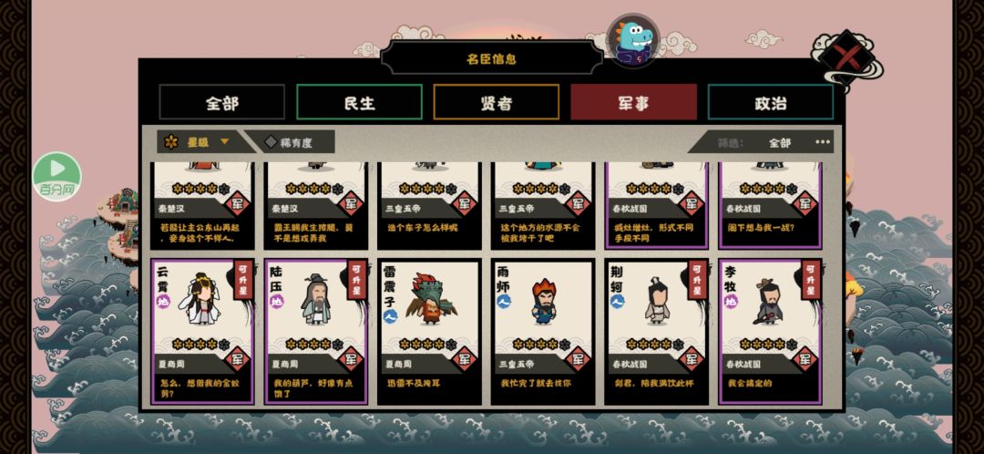 啊,又是摸鱼的一个周,不过保守估计再过两个周就可以全名臣满星了,这样就可以给大家带来一些具体有效名臣组合和对名臣强度的评价了。 这个周主要肝了三皇五帝和春秋战国的几个军事名臣,三皇五帝的力牧,女魃,雨师,春秋战国的吴起,孙膑,李牧,荆轲,豫让。开始我是中规中矩的,把豫让放到三皇五帝和李牧,女魃 ,雨师一起刷,然后带吴起刷孙膑,李牧,荆轲这战国F4,后来发现这是错误的。这样的话刷战国很舒服,开局攻占