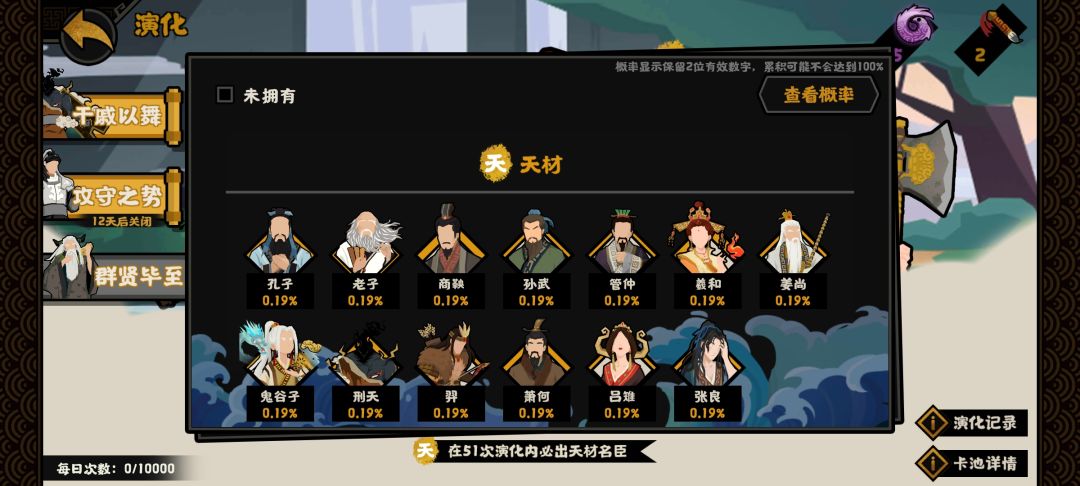 很多人都在演化池里执迷不悟,先来看看演化池里的主要天阶; 孔子在春秋战国还行,其他时代泛用性不如老子; 老子加民心最强卡了,但民心看你玩法,很多时候用不着加民心; 商鞅降腐败一流,的确很强; 孙武提战力、用间等级,偏向于辅助型; 管仲尊王攘夷感觉威力和泛用性都不如虞姬承志,加钱不如羲和来钱快; 羲和比较符合休闲游戏的玩法了,但日御冷却时间太长,与其每二十分钟上一次线,还不如三小时上一次线; 姜尚