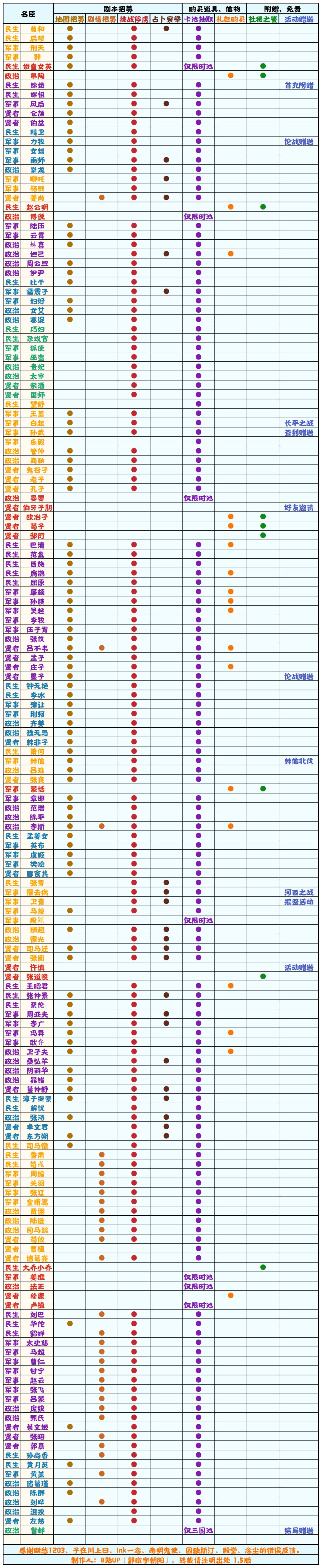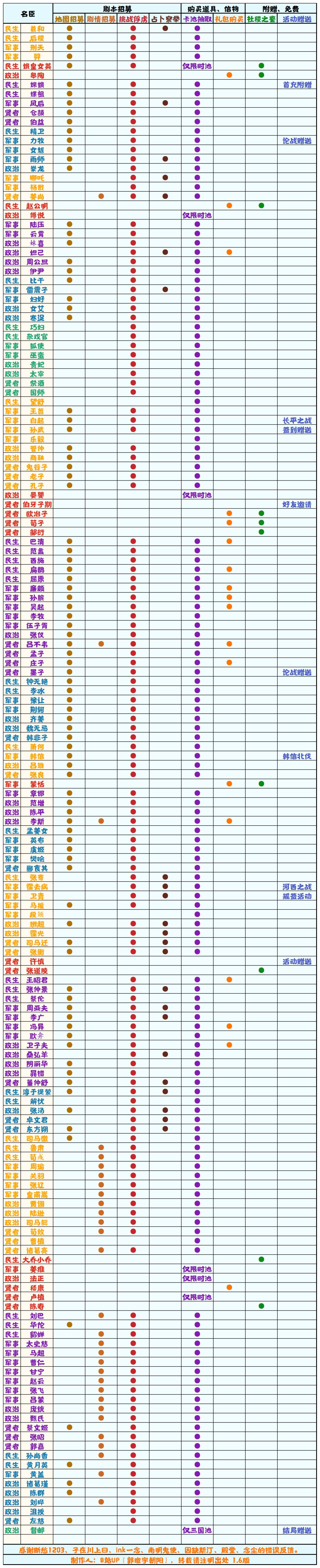 【无悔华夏】名臣获取方式一览表1.5;名臣获取补充表1.3