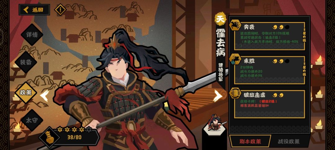 大汉军事名臣只有四位 霍去病、卫青、周亚夫、李广 (都以5星评价) 先说一下霍去病 一技能奔袭:进攻胜利时候,夺取10%的钱粮,累战可以选择状态【追击3级】,敌方未进入我方半场时,敌方格挡率-50%,需要1马启动 这个技能完全是妇好下位,抢夺10%太少,不如妇好的20%,还需要1马才行,而且累战状态这个追击技能基本上不会出来(可能是我还没五星的缘故,反正我四星累战没出过这个追击的状态),因为需要1