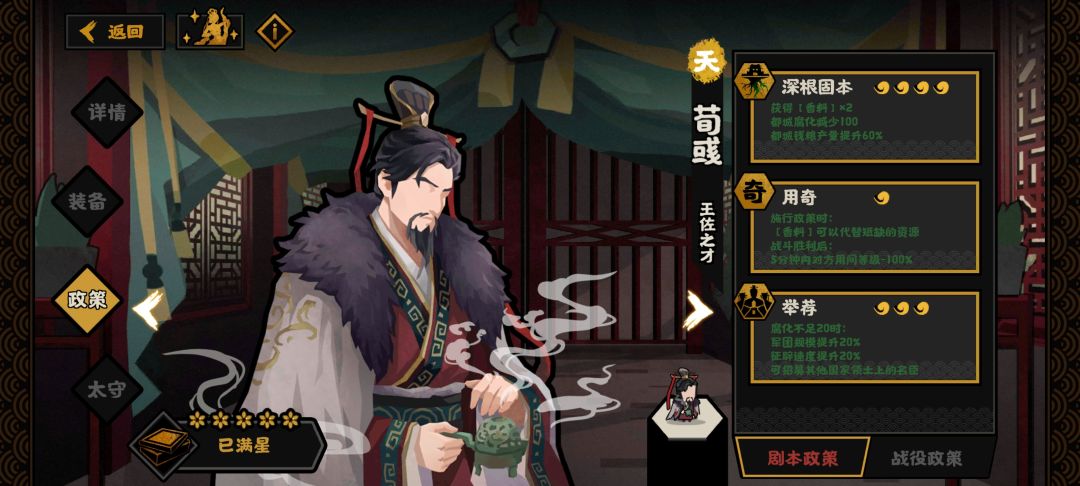 写在前面:本文综合考虑名臣本身政策以及太守效果和阵容搭配组合。如何搭配取舍请参考自身需求。 推荐度划分: ①推荐:建议升级装备,且装备等级越高越好。这类太守效果本身抵得上一个名臣政策。 ②中等:起到锦上添花的作用,本身太守效果在同类型名臣中强度尚可,但受限于名臣本身强度或同类型名臣强度。 ③较低:本身太守效果无负面影响,但受限于名臣强度不足。或者本身太守效果强度合格,但受限于负面影响较大且名臣本身