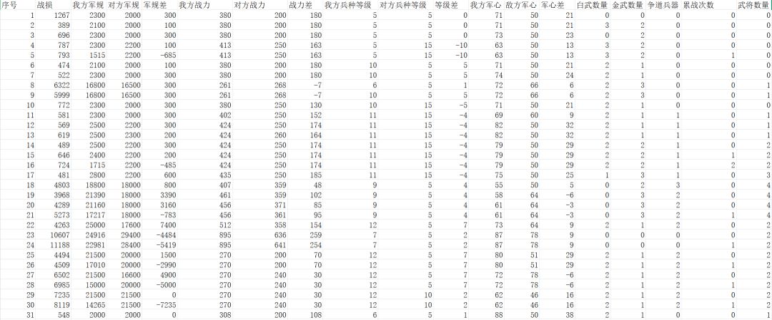 写在前面:不想看过程的可以直接跳到数据与解读或者结论部分 基于多元线性回归模型的自动战斗战损影响因素研究:把资源投入到哪方面可以最大化自动战斗收益? 一、研究背景 手游无悔华夏中的自动战斗由来已久,最早可追溯到三国鼎立剧本。然而,彼时的自动战斗带有系统强制的性质,且其造成的战损数据较为非常规,不能被多数玩家接受,因此遭到了广大玩家的抵制。而在2025年隋唐版本,官方上线了新的自动战斗系统,这种新的