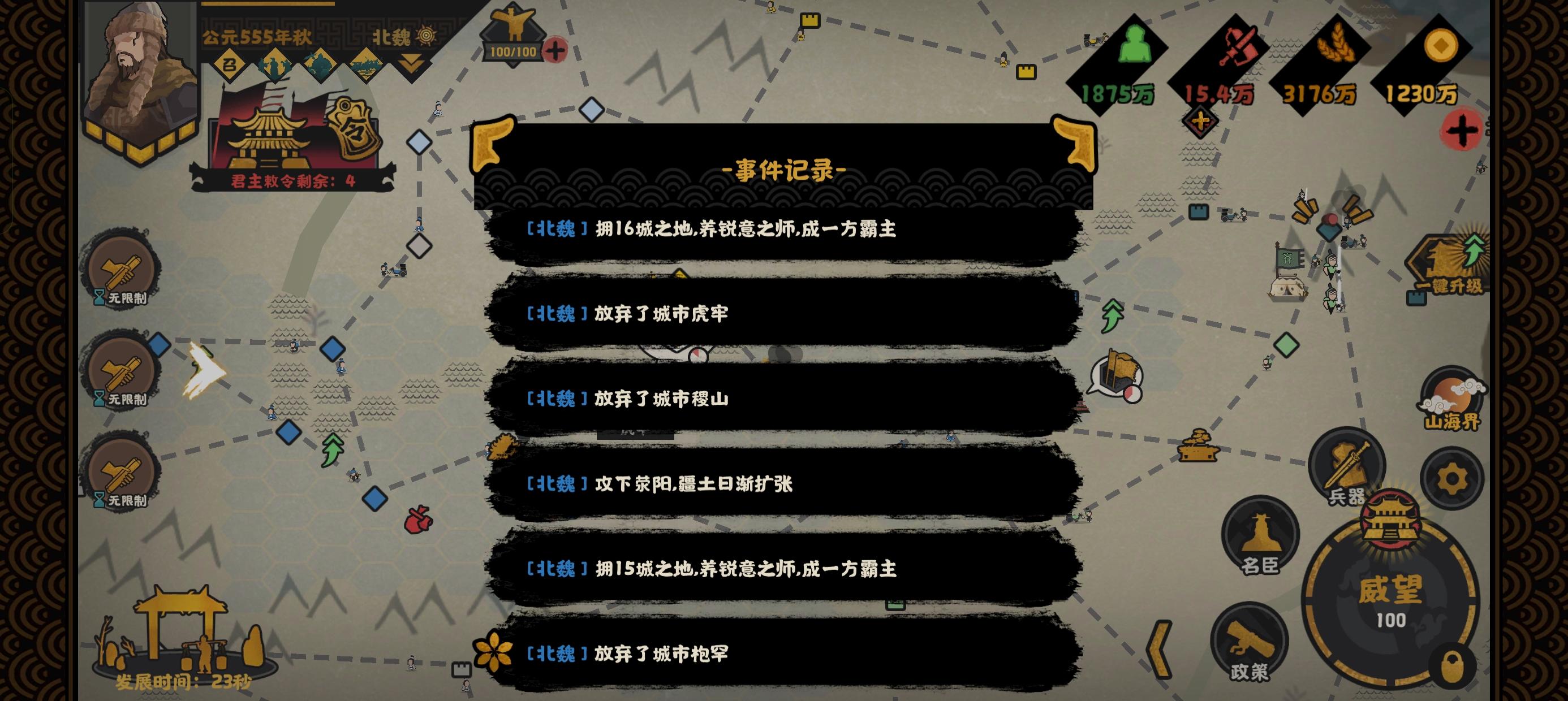 无悔华夏这么多年来终于出现了无限叠科技的名臣,今天吴道子爆料的时候我就想到了,我游唯一一个名臣自带循环加科技的就是邓绥,但是有文化限制,现在吴道子可以无限加文化,绝配!