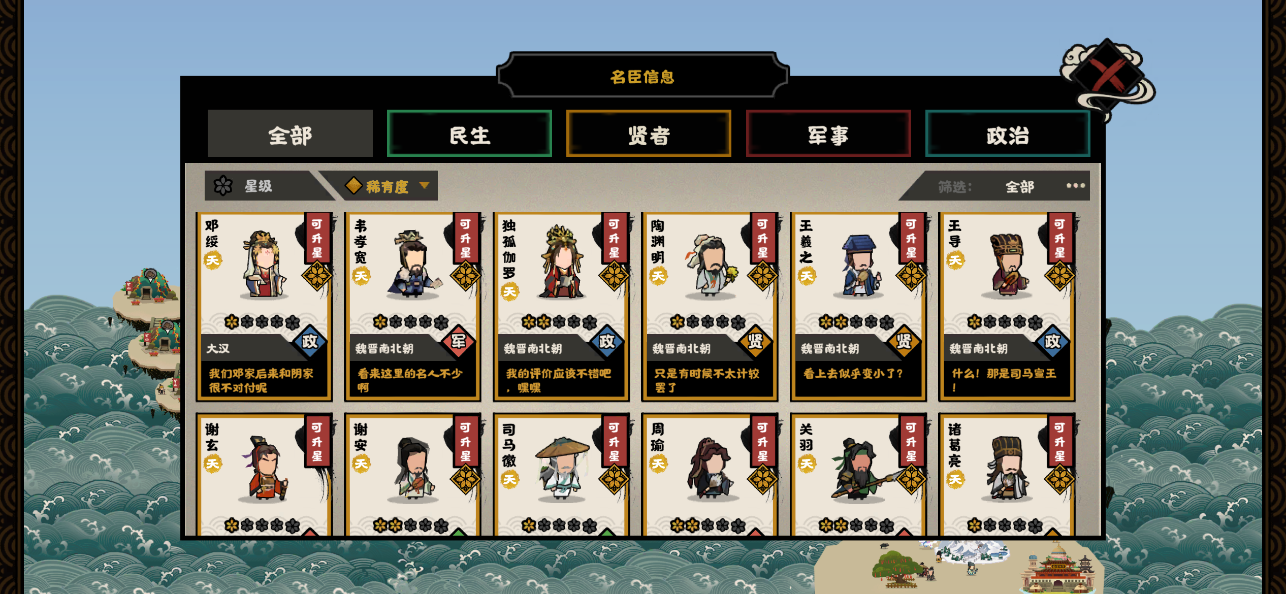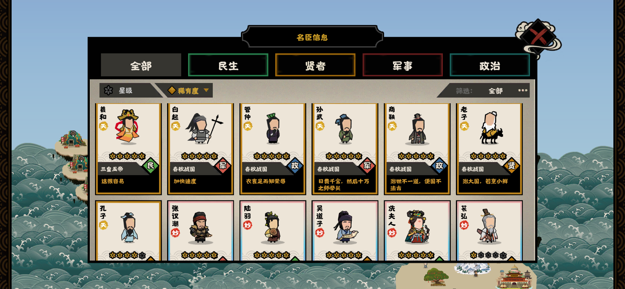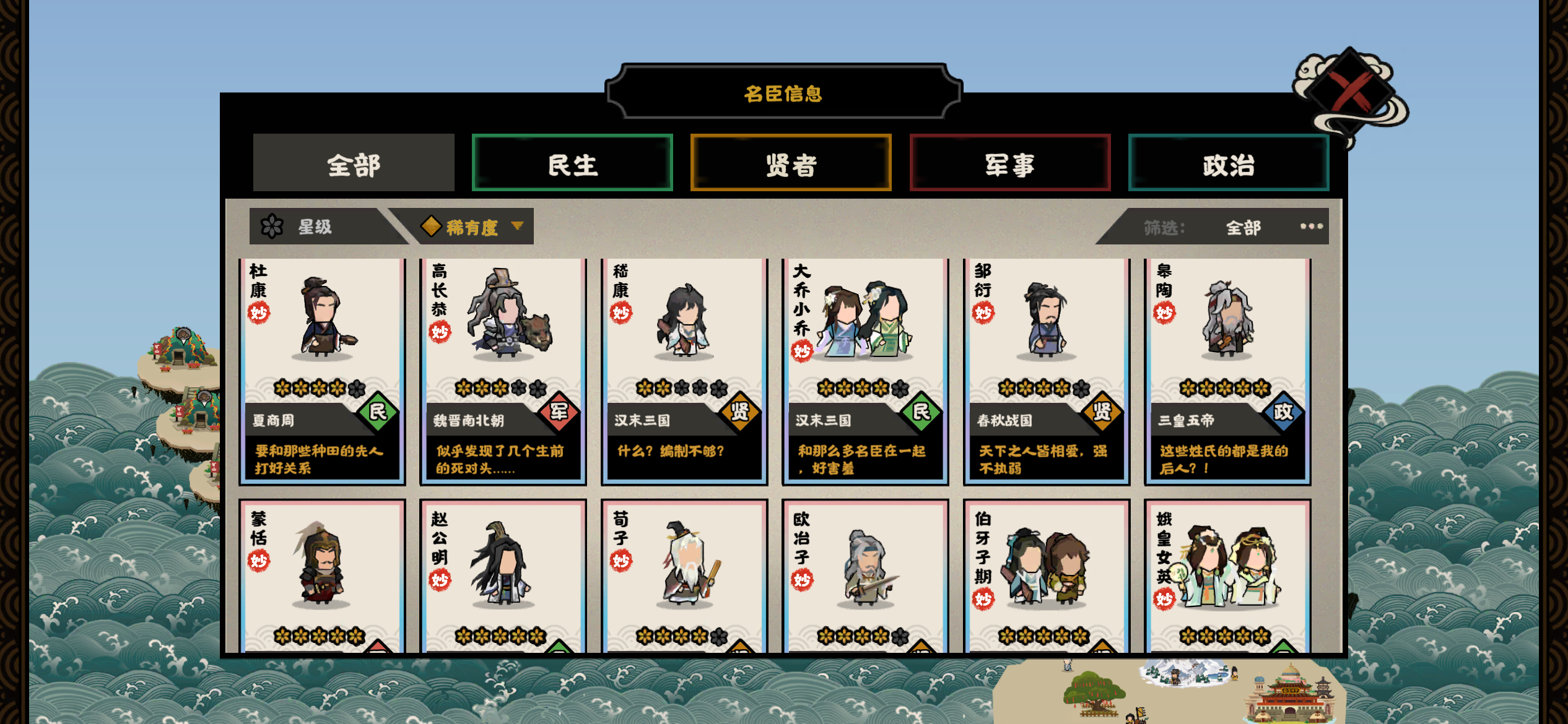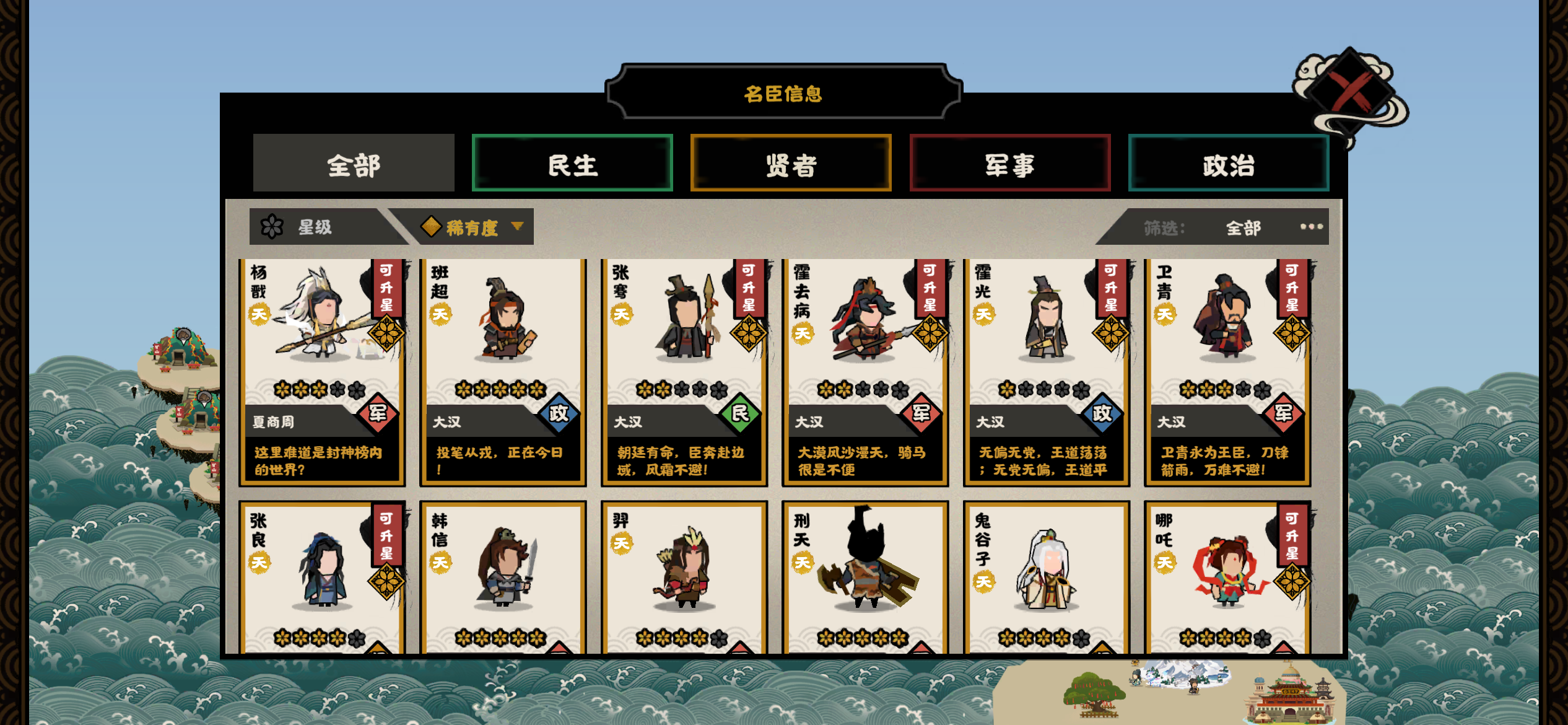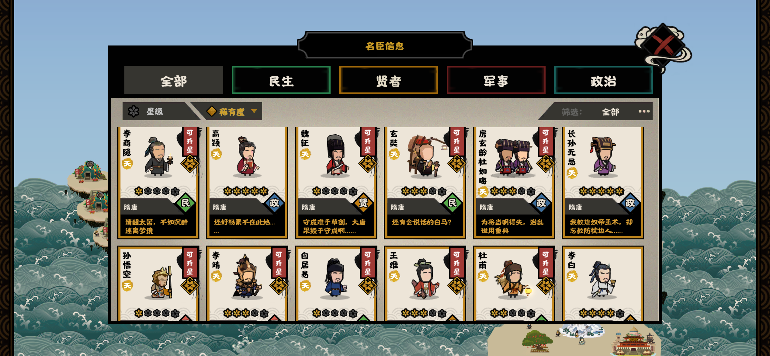 无悔华夏这么多年来终于出现了无限叠科技的名臣,今天吴道子爆料的时候我就想到了,我游唯一一个名臣自带循环加科技的就是邓绥,但是有文化限制,现在吴道子可以无限加文化,绝配!