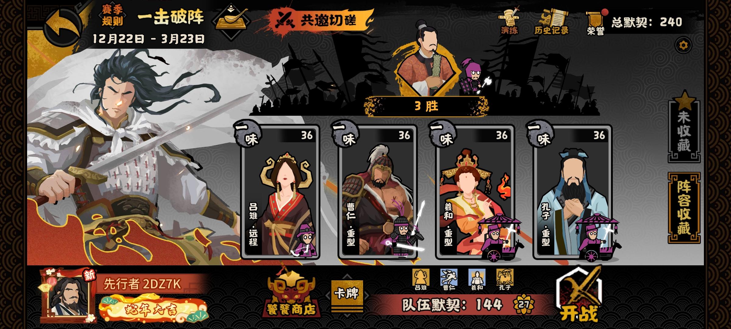 思路:1.主公兵给完加成就给吕后卖掉2.依靠孔子和吕后达成开局40%格挡20%攻击3.用羲和发育造三个60%格档的盾兵,搭配死士反扑#浅评一下