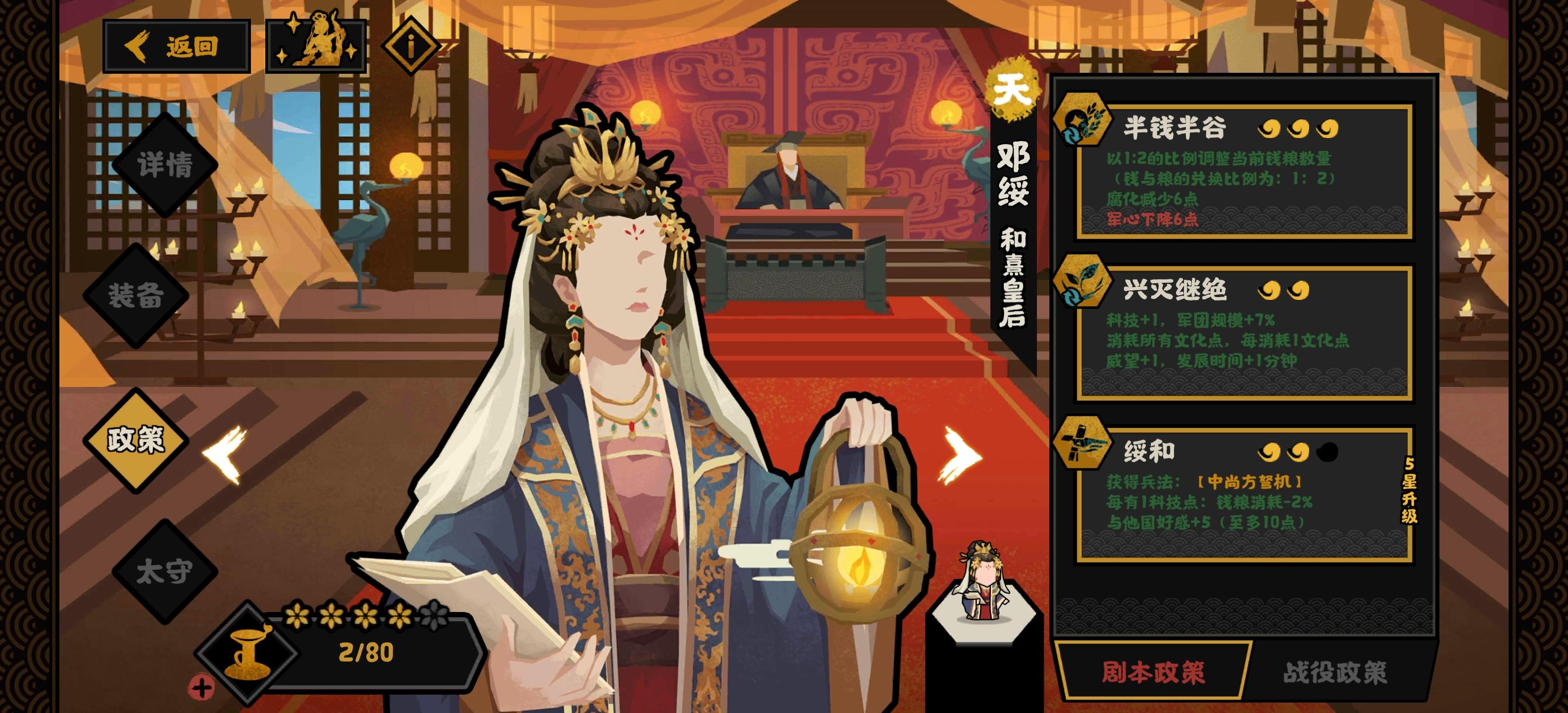 写在前面:各位王上们好呀,我是子在川上曰。依照惯例,根据名臣的实机政策做一个简单分析,一切效果以正式服为主,有独特的想法和见解也欢迎留言探讨呀~ 一、剧本政策①吴带当风 名臣重要政策,施行不需要特资。 施行后可获得5点文化点与2点科技 政策的优点在于:政策施行简便,无任何负面。 政策的缺点在于:无。 ②变相 名臣核心政策,施行需要至少拥有5点文化点,常规循环冷却为5分