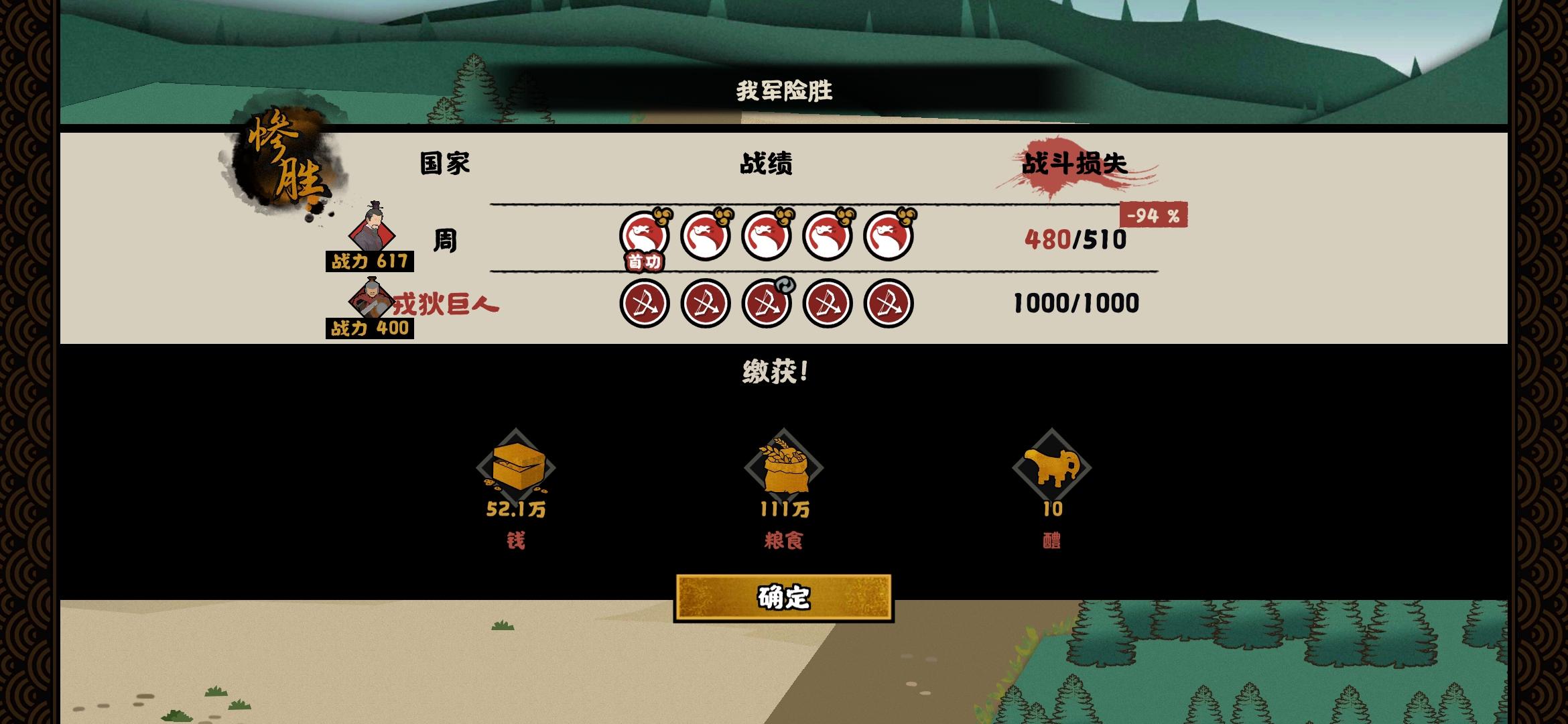 这个战力差距再加上骑打弓是怎么能打出这损失的,这种战斗就算什么都不做不也应该是平推吗,打的时候我这骑兵冲过去对面跟不掉血一样,要不是有外援技能可以用加了点兵这估计都打不过,这战力比一国军队都高,每次打流寇都给我一种后台改数据强行提难度的感觉,毕竟这要是打不过就不能建造设施发展,就算不说这个战力数值比其他国家的高,单说这数值差距我毕竟是战力高出了200,还是兵种克制,这都是把能用的牌都用了才险胜这咋