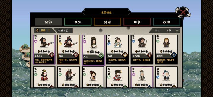第四把了,终于要攻守易型了。我现在1500+战力出征+5,每年+48(还要往上涨)与他打一场我1%战力和军规不足挂齿玩了几天了,终于等到这一刻了。抖音上看了名臣攻略,孟浩然+王维我的阵容:民生:孟浩然(开局100民心就可得100诗意)军事:善鸣鹅(噶了换周瑜顺带得个特资)周瑜:+20%军规,+20战力+2乐感,武将周瑜(带火弓)政治:颜真卿(每年春秋+2军心,民心,临时战力+2