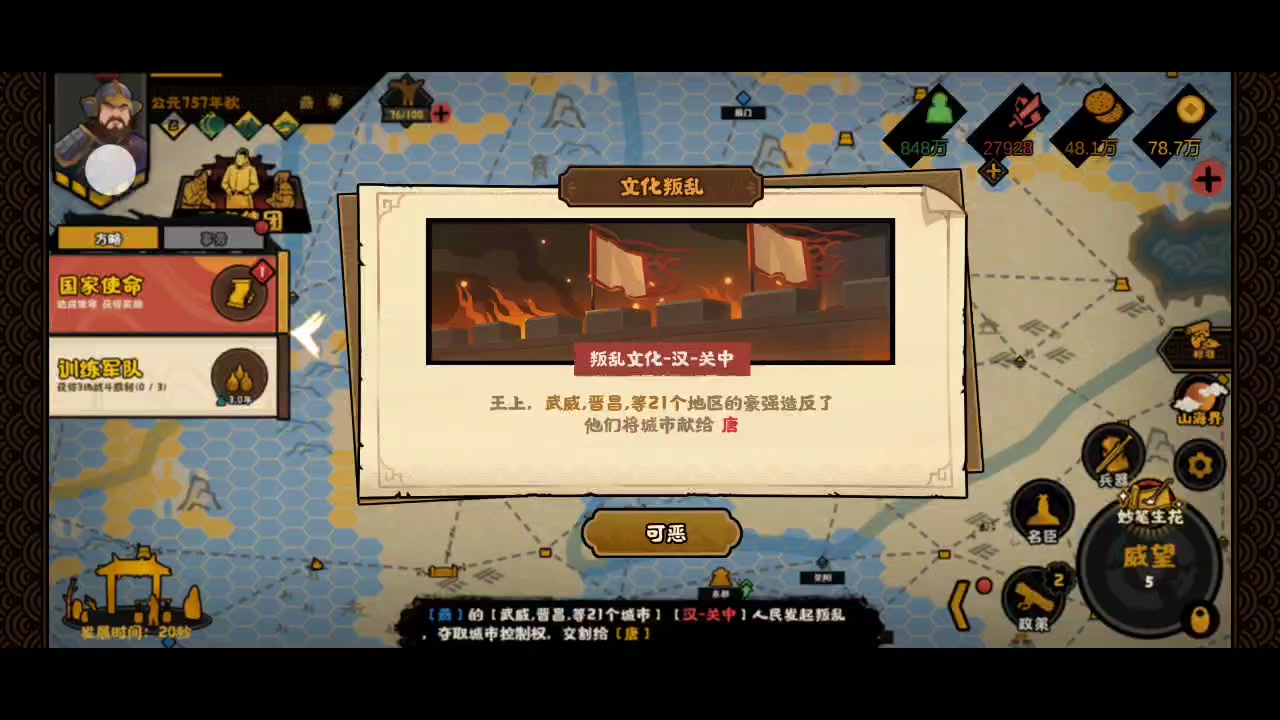 大家好,我是乐趣实验室的骆驼~ 马上就到新年了,我代表乐趣实验室的全体开发成员和发行组的全体成员,在这里祝大家新春快乐~今年是丙午马年,那自然要祝大家在新的一年里,一马当先,万事胜意!天天红红火火,生活越来越好! “安史之乱”剧本已经上线了,大家打通了哪个势力呢? 在这个历史上的重要的转折点,大家做的选择让大唐走向了何方呢? 有人打出这个结局了吗? “含章可贞,或从王事”,我还满