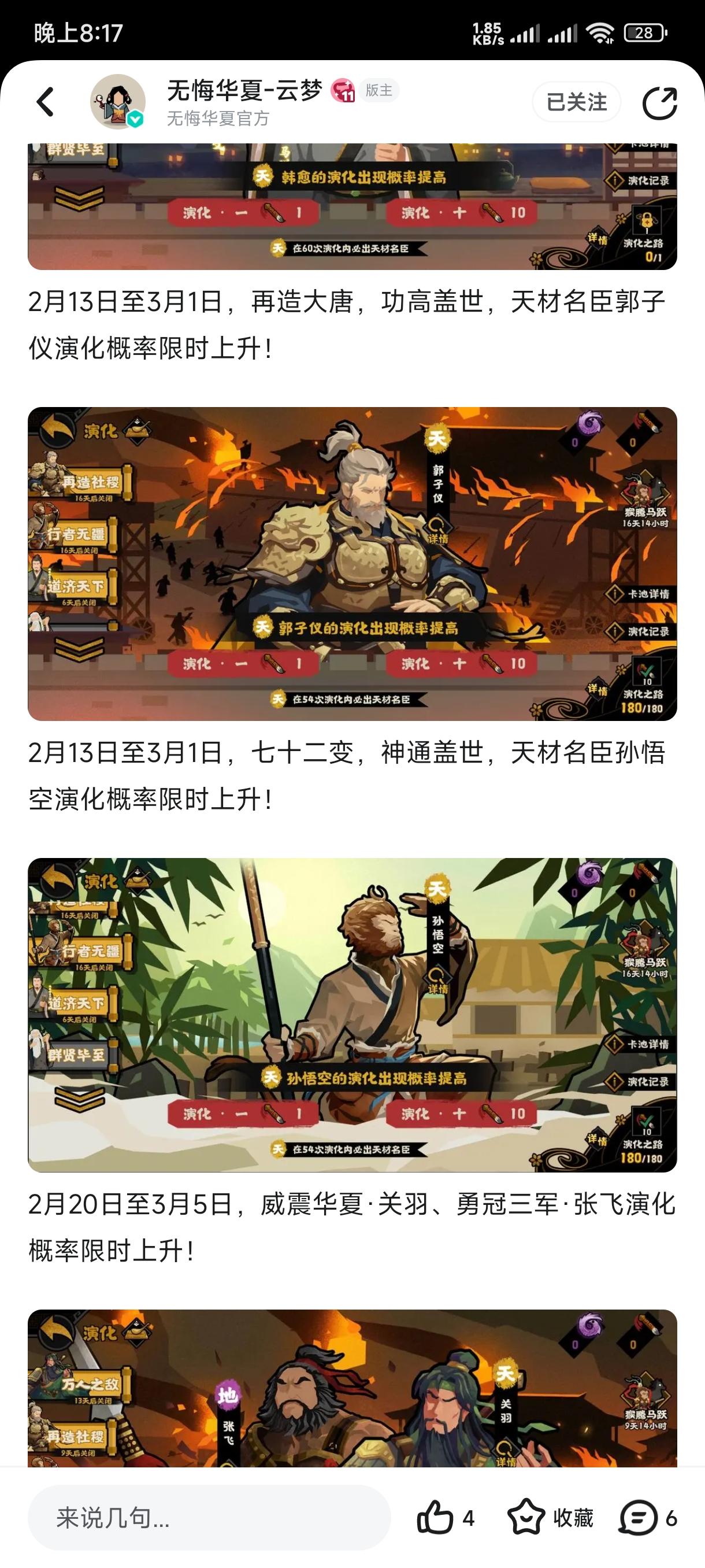 看来前瞻,说是会出两位君主,一个李隆基免费送,另一个我估计是嬴政,就是比较好奇嬴政的品质了,我感觉最多红,高了就有点搞笑了#无悔华夏 #安史之乱
