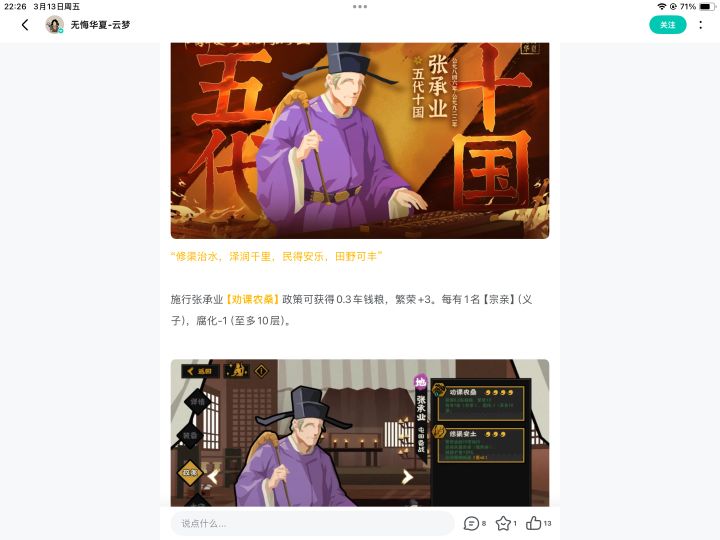 锵锵!王上们好呀,这里是云梦又到了大家最期待的名臣爆料时刻4周年庆全新主时代《五代十国》3月20日就要上线了我们终于要踏入那个干戈不息,却也英雄辈出的时代在这个政权更迭、烽火连天的乱世既有长乐老在十朝中坚守的“为国尽忠”也有沙场骁将拒契丹于幽州城下的铁血丹心更有花间词人的笔底烟霞......五代十国全新名臣及专属政策系统即将上线一起来看看本期五代十国《名臣爆料》(上) 一、冯